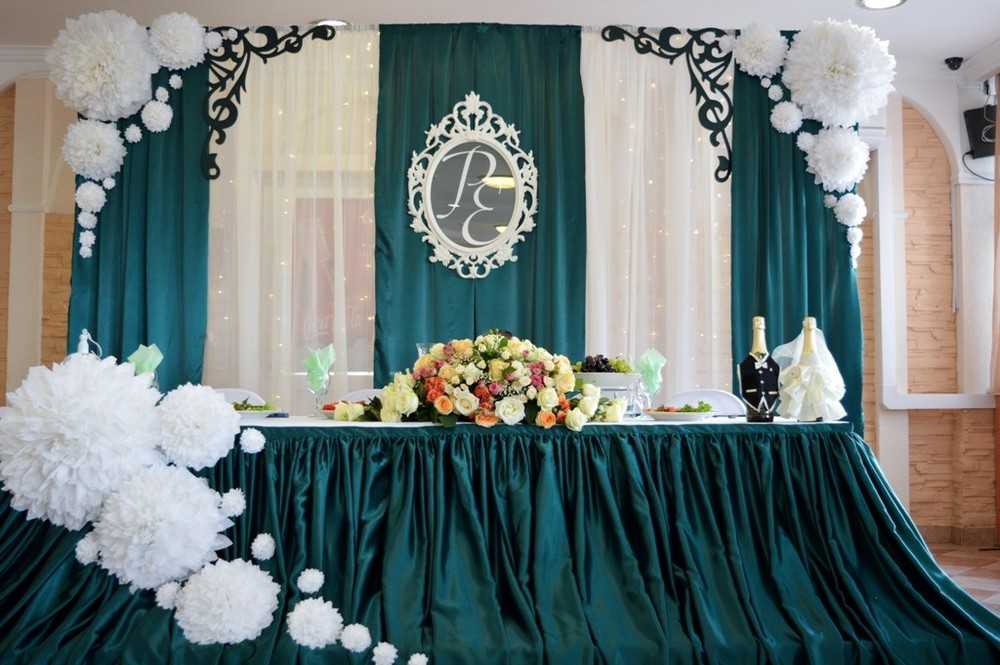 Лейтмотивом изумрудной свадьбы должен стать зелёный цвет. Пусть он звучит в акцентах, деталях, аксессуарах – салфетки, фужеры, воздушные шары в декоре, растения с глянцевыми листьями, банты на стульях. Основным же цветом для оформления банкета лучше выбрать белый. Он прекрасно сочетается с изумрудной гаммой и выглядит торжественно и празднично.