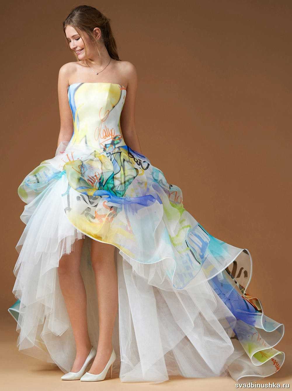 В цветном варианте эти платья отличаются от коктейльных незначительно. Разница может быть в наличии сложной вышивки, кружев, страз и других декорирующих элементов. И, конечно же, образ невесты определенно обозначит фата, шлейф, прическа с украшением.