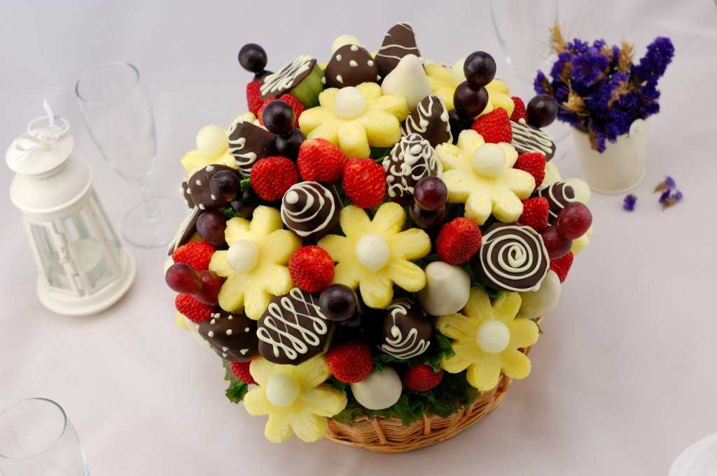 Техника создания подобной композиции абсолютно идентична процессу изготовления простого фруктового букета.