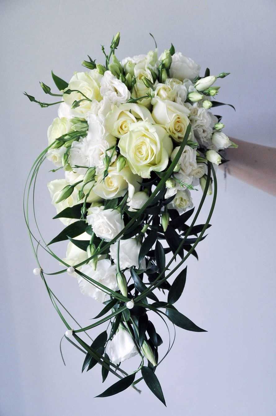 Каскадный букет, композиция которая плавными линиями каскада напоминает водопад. Срезанные цветы с длинными стеблями с более короткими веточками, создают шикарные переплетения, образуя пряди . Изумительно смотрится такой букет в руках высокой невесты.