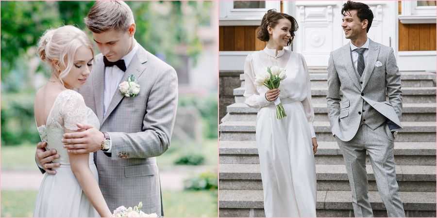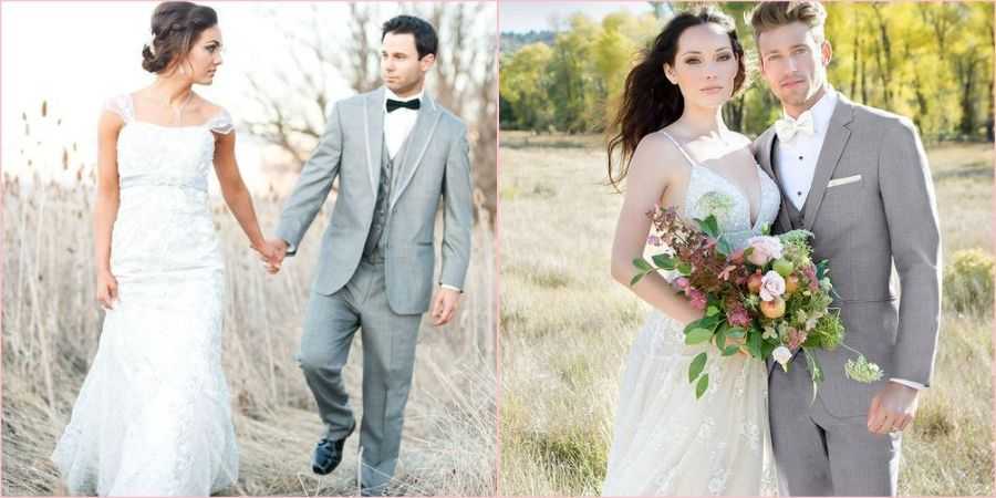 Данный цвет в последнее время очень популярен как в оформлении свадьбы, так и в образах молодых. Серая расцветка на женихе выглядит очень благородно и утонченно. А вот невеста в таком случае может подобрать себе белое нежное летящее платье с кружевными вставками.