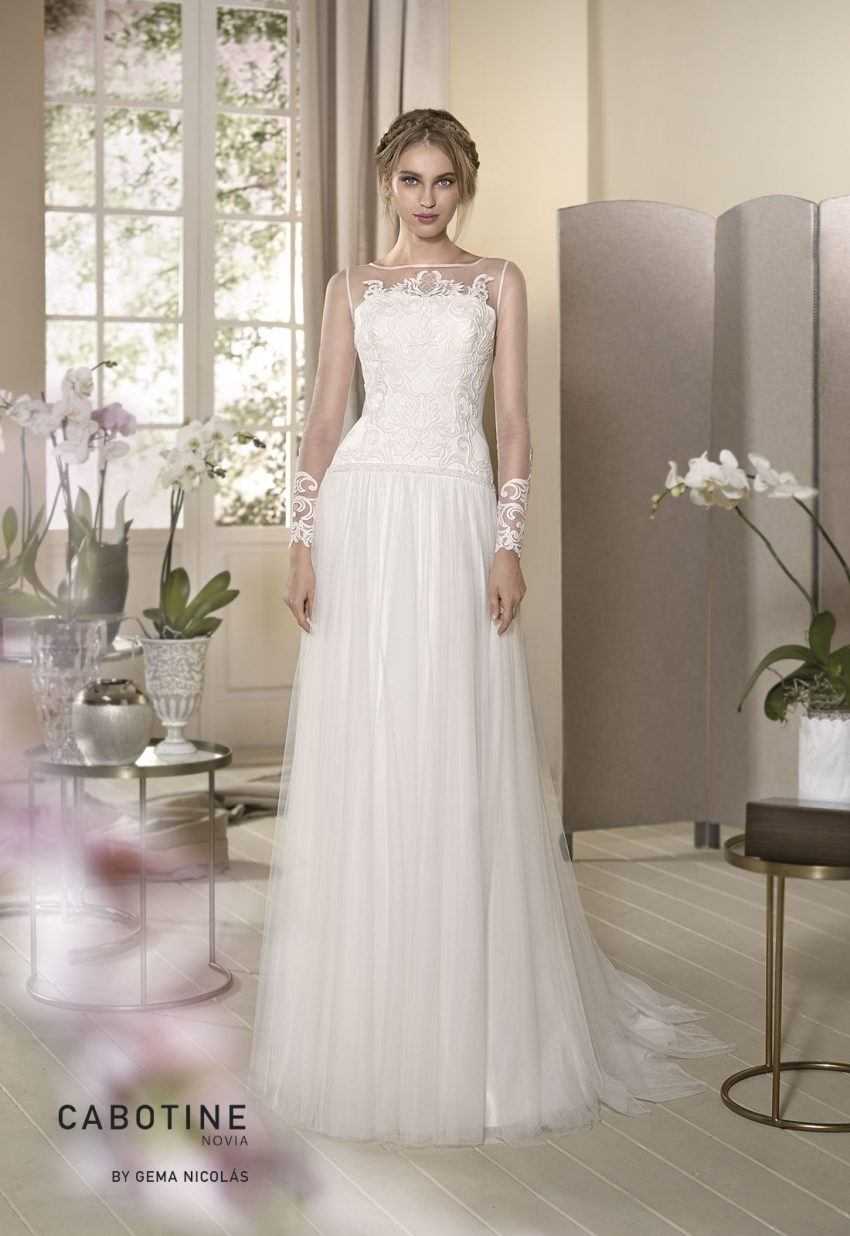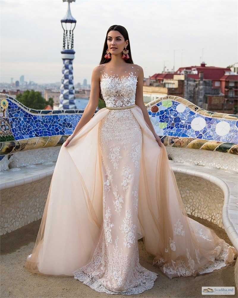 Прозрачное декольте – это пик свадебной моды текущего года. Нежно покрыв плечи кружевом, вы получите романтичный образ невесты. Даже с откровенным корсетом, кружевная ткань прикроет все деликатные зоны и позволит без смущения носить такой наряд. Фасон не подразумевает необходимости в украшениях на шее. Следует дополнить образ серебристым браслетом или серьгами, тогда ваш облик будет завершенным.