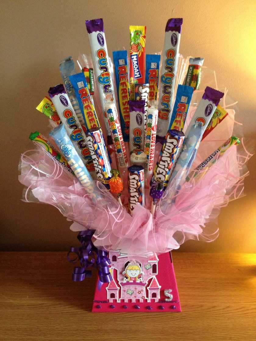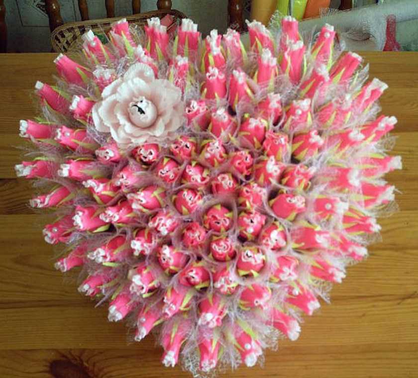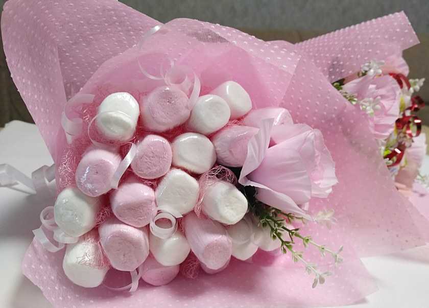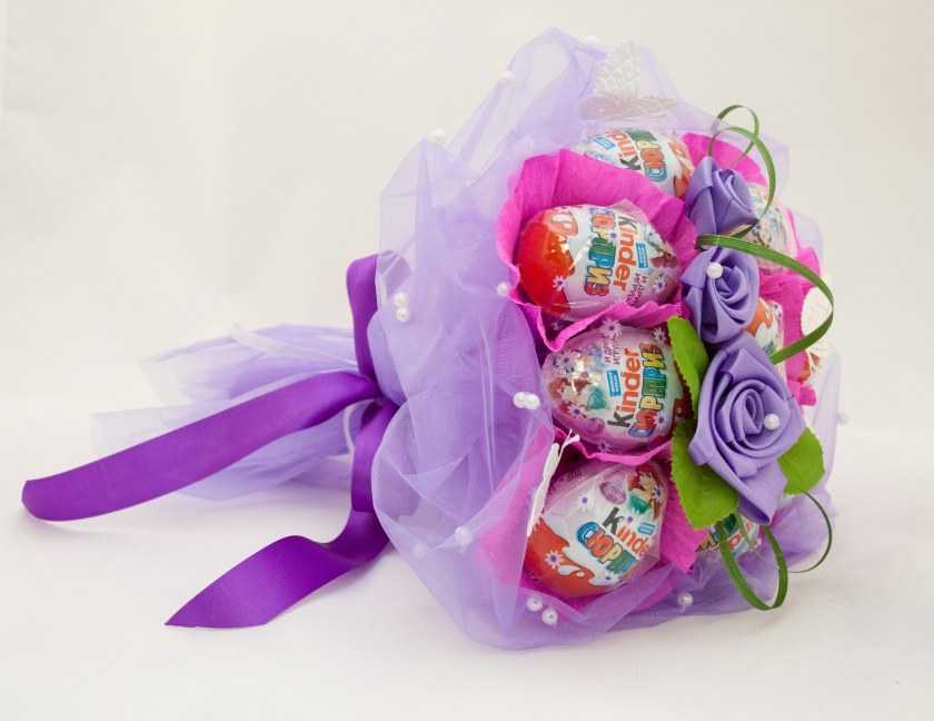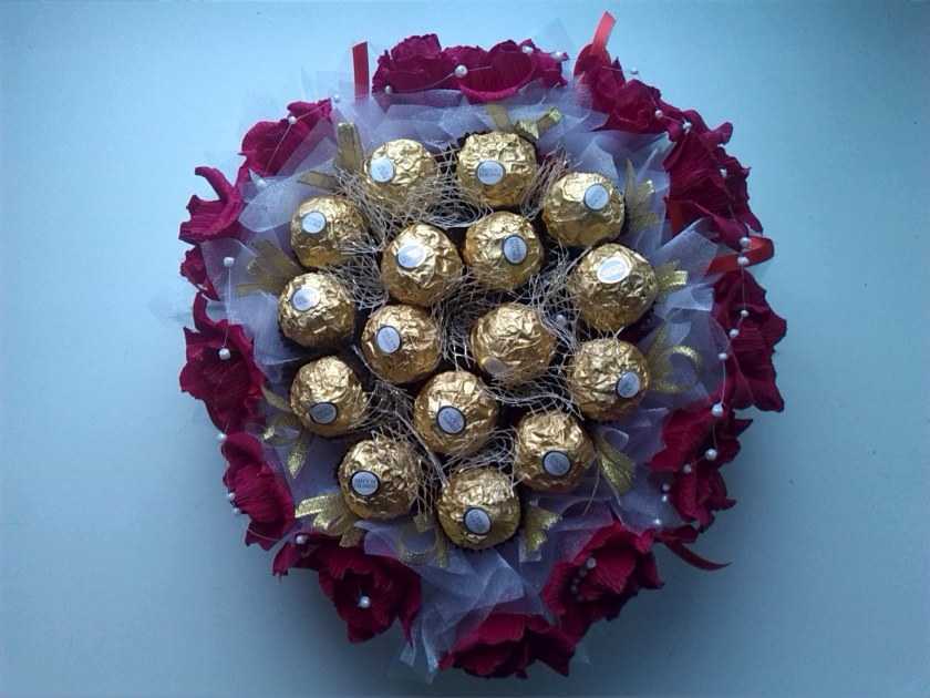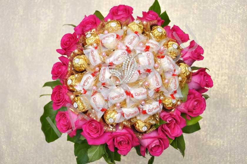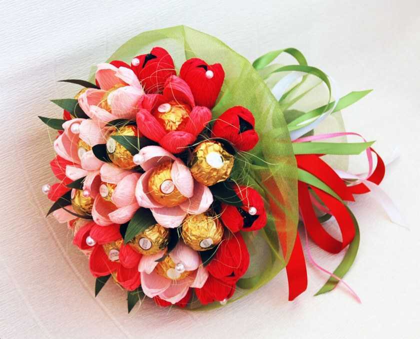 Это самый распространенный сладкий подарок, который идеально подойдет для женщин. Есть множество способов изготовить конфетный букет. Для его создания можно использовать шоколадки, конфеты Raffaello, другие сладости. Самый простой букет делается с использованием чупа-чупсов. Для этого достаточно купить чупа-чупсы и обернуть их в красивую оберточную ткань для цветов – маленький оригинальный букет готов.