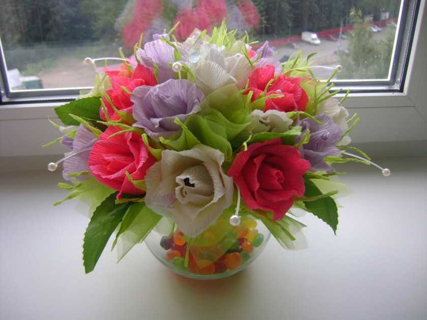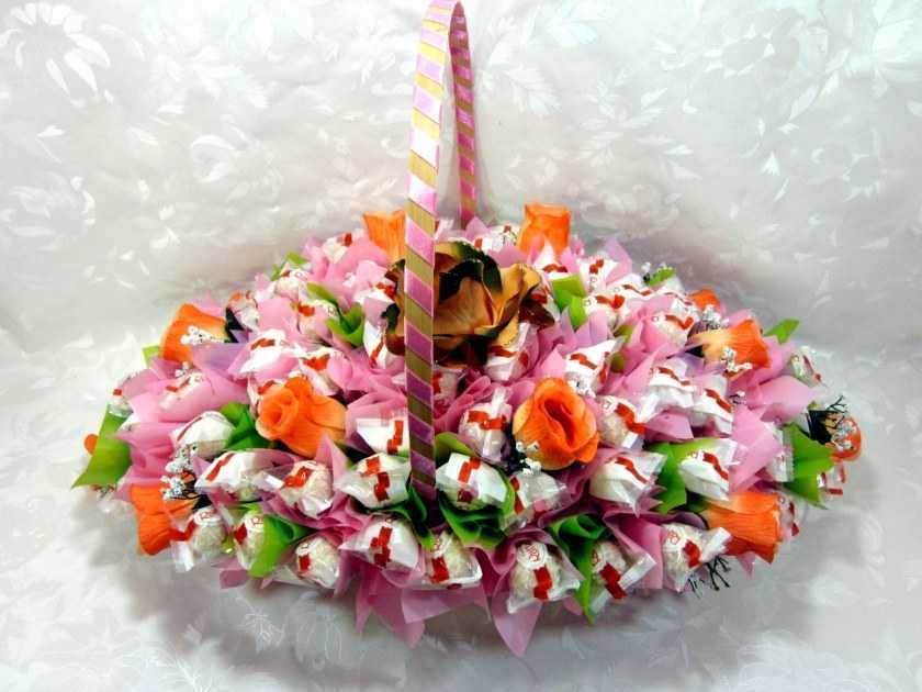 Каждую конфету надежно зафиксировать на проволоке, обернуть лепестками и чашелистиками. Каждый цветочек аккуратно вставить в корзину, задекорировать лентами, бантами, воздушной органзой. Украсить корзину.