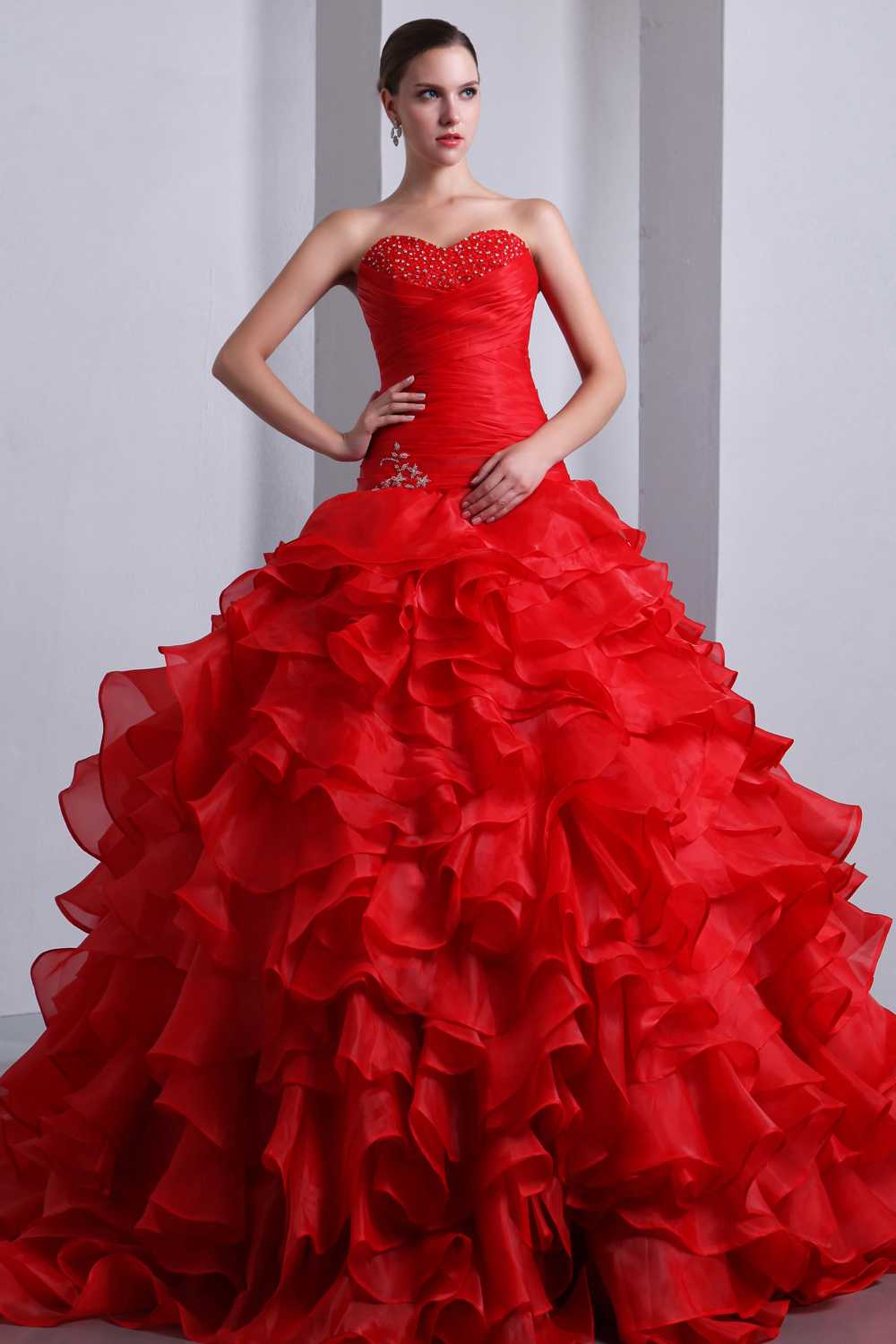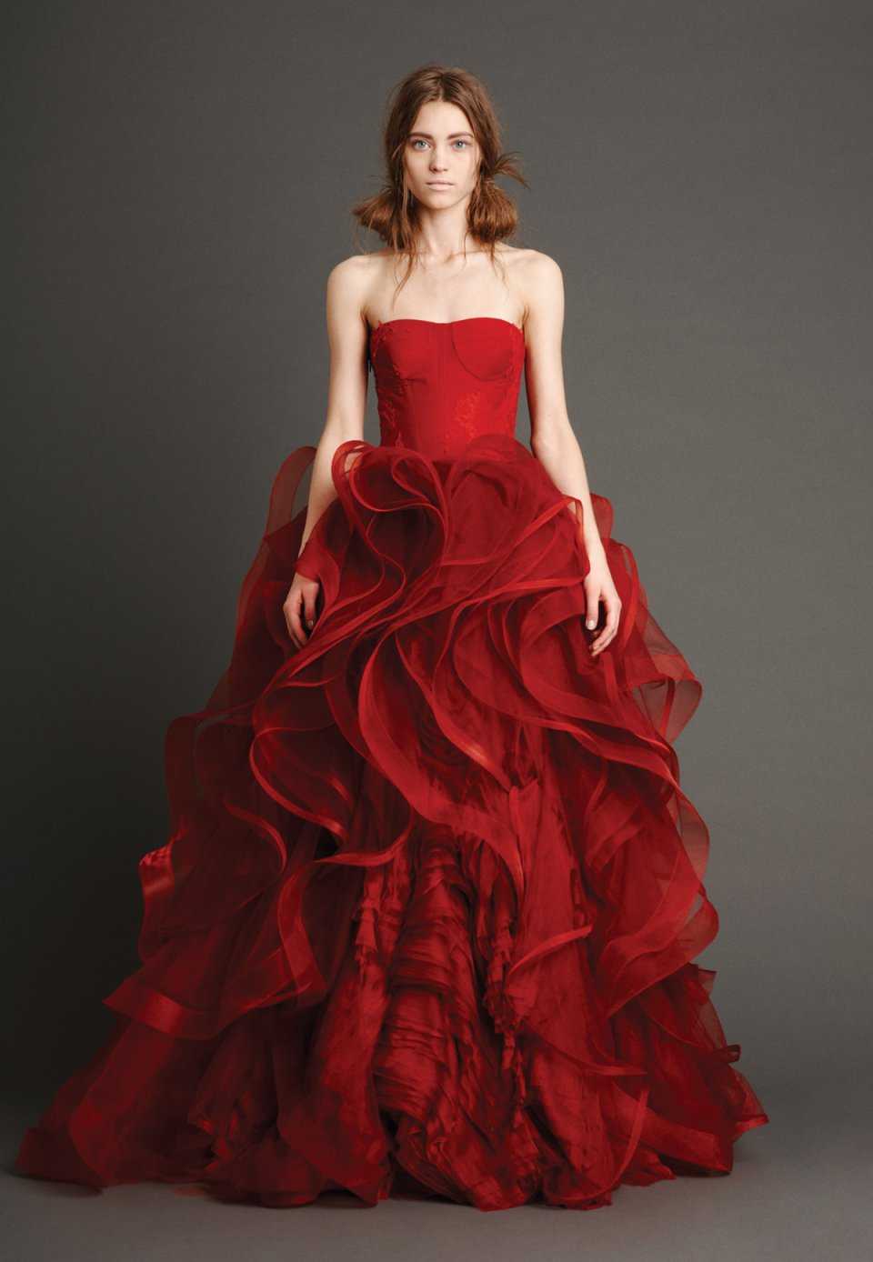 Для роскошных бракосочетаний торжественное пышное красное свадебное платье подходит больше всего. Напоминая наряд принцессы, оно, как будто сходит со страниц детской сказки. Девушка, окруженная пышными фатиновыми юбками, подъюбниками выглядит легко, а корсет подчеркивает красивую линию декольте, тонкую талию. На первый взгляд все просто и хорошо знакомо, но от этого созданный лук не выглядит менее привлекательно и изыскано.