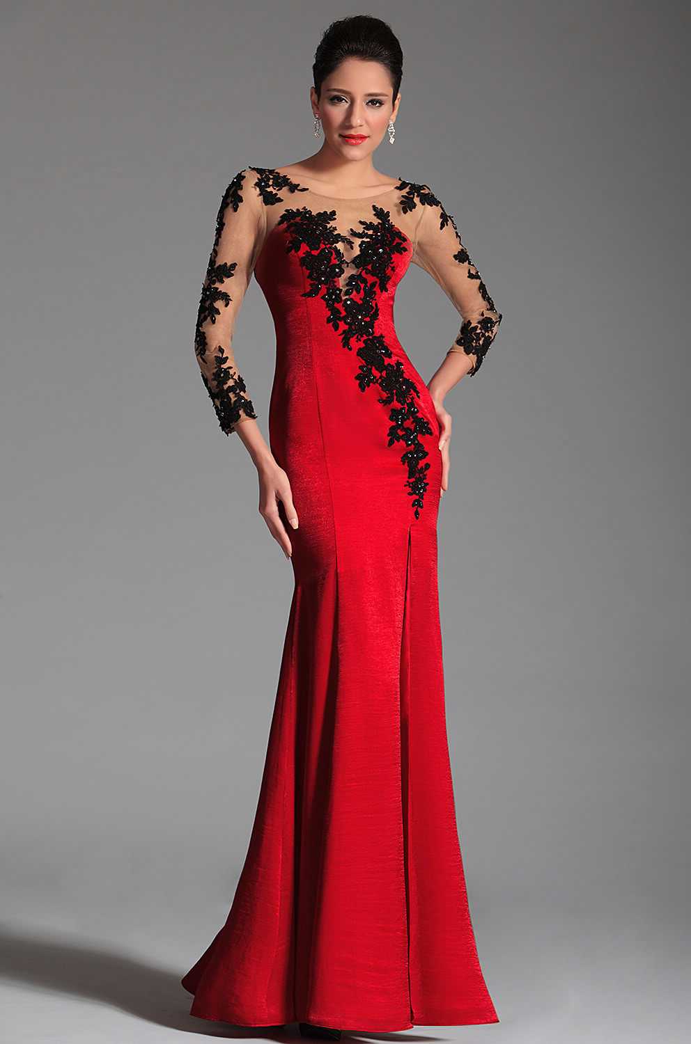 Обтягивающее платье строго в пол из легкой однотонной ткани, например, кружева. Такой фасон визуально прибавляет рост и вытягивает силуэт.