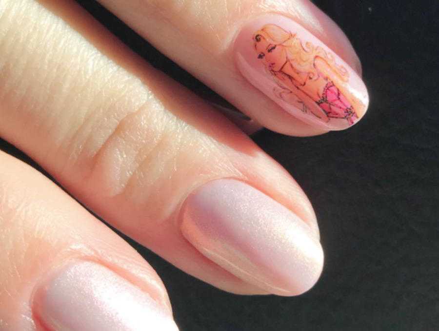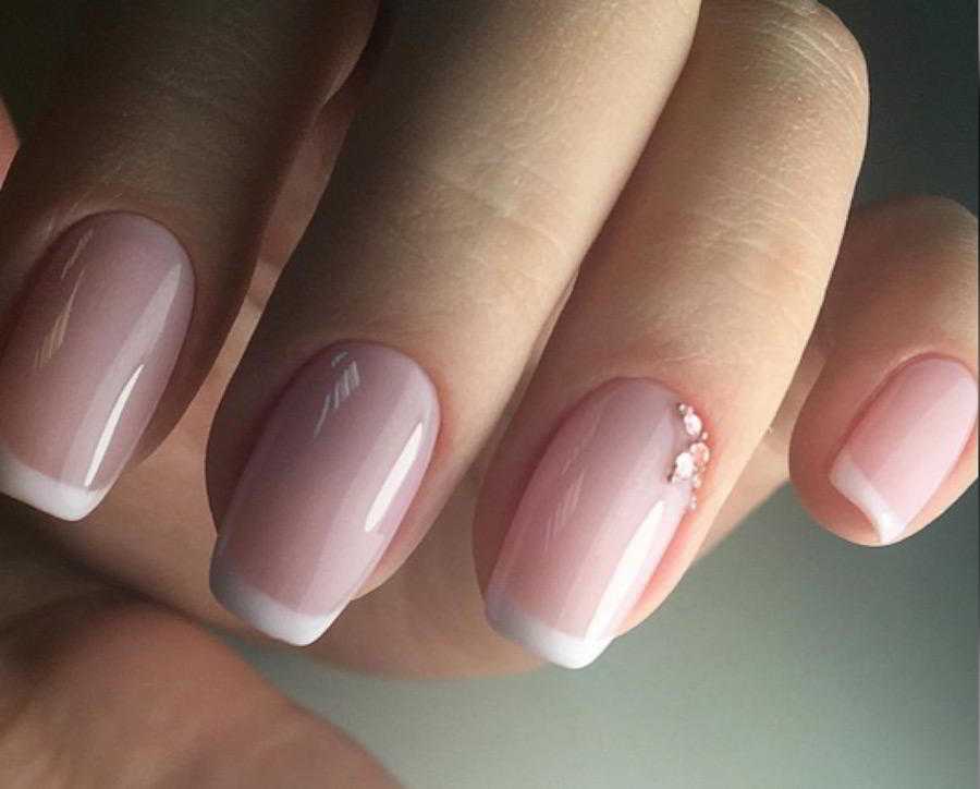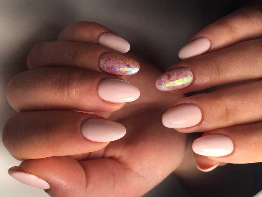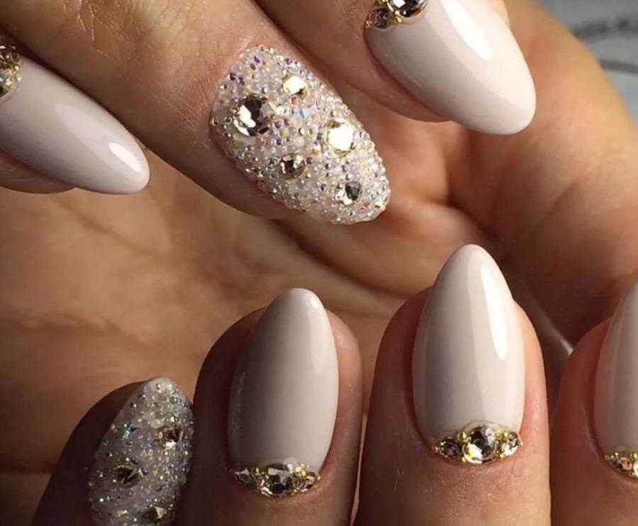- Перламутровые лаки светлых оттенков и акцент с помощью камешков или страз на безымянном пальце. Все ногти покрываются лаком одного тона, а на ноготь безымянного пальца поверх лака наносится тонкий слой из украшений;