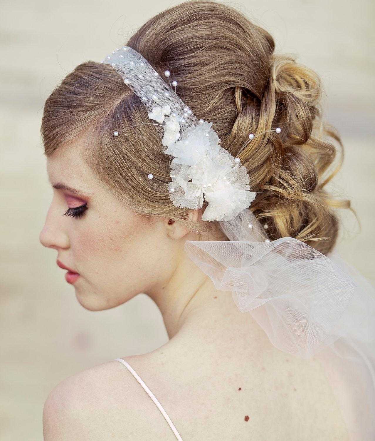 Этот аксессуар также имеет необычный способ крепления. Ткань собирается в множество складок на заколке и окутывает невесту пышным облаком.