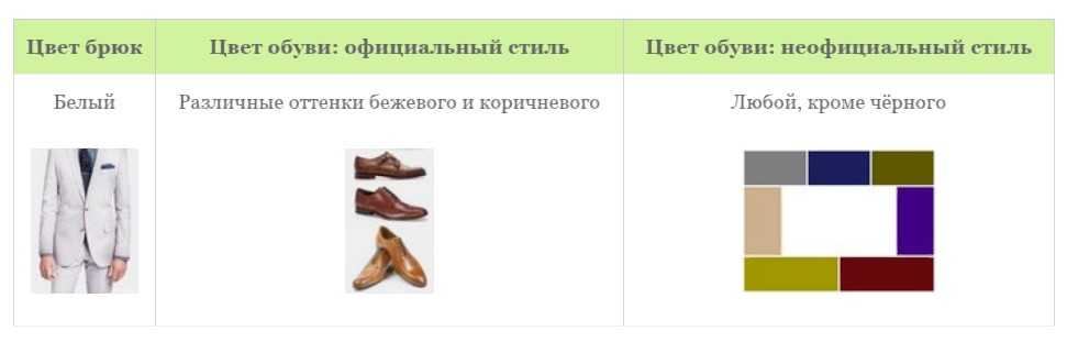 Надеемся, что статья окажется полезной и поможет правильно подбирать цветовое сочетание брюк и обуви. Чтобы не ошибиться, используйте больше универсальных цветов, но и не бойтесь экспериментов.