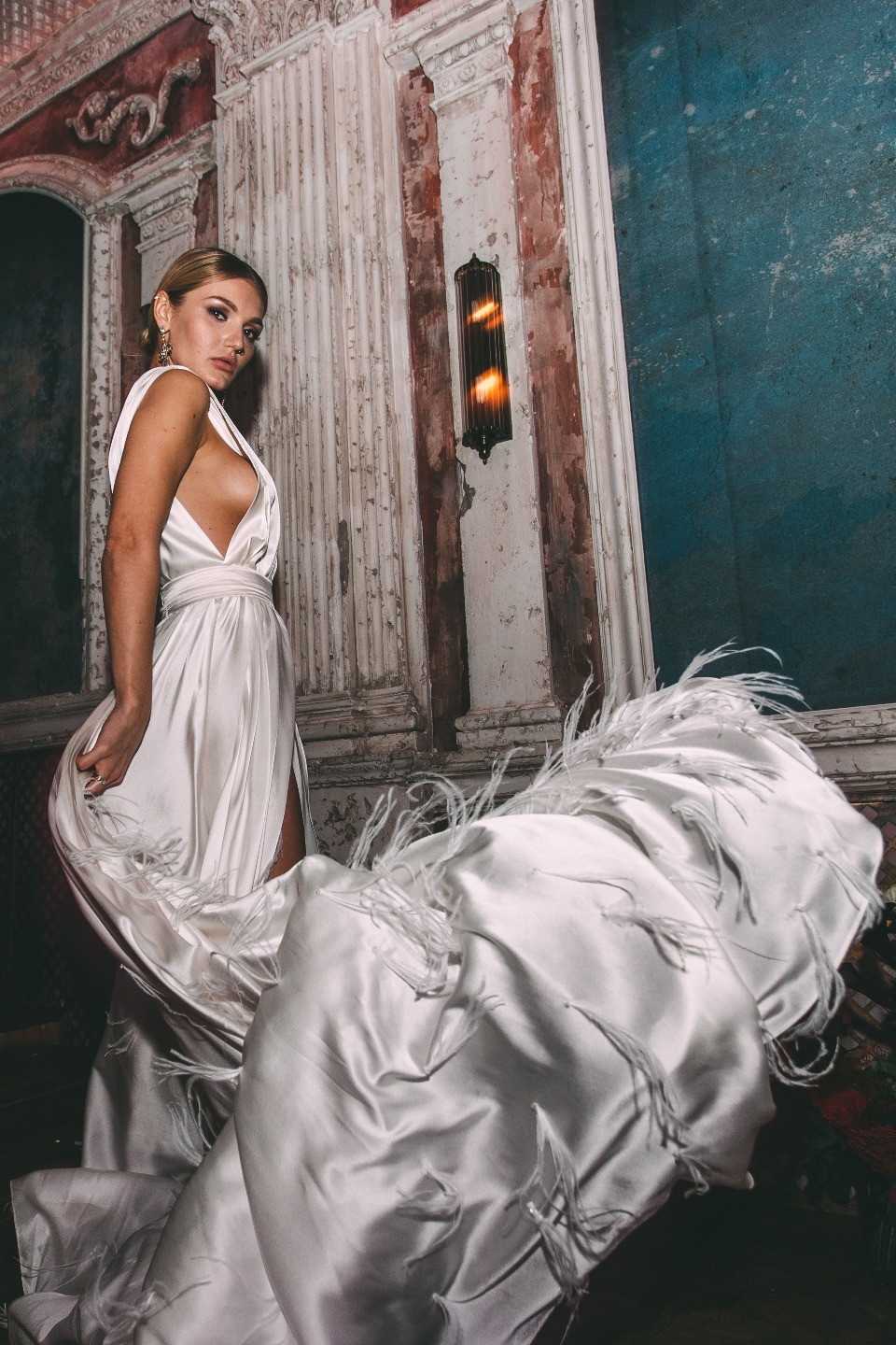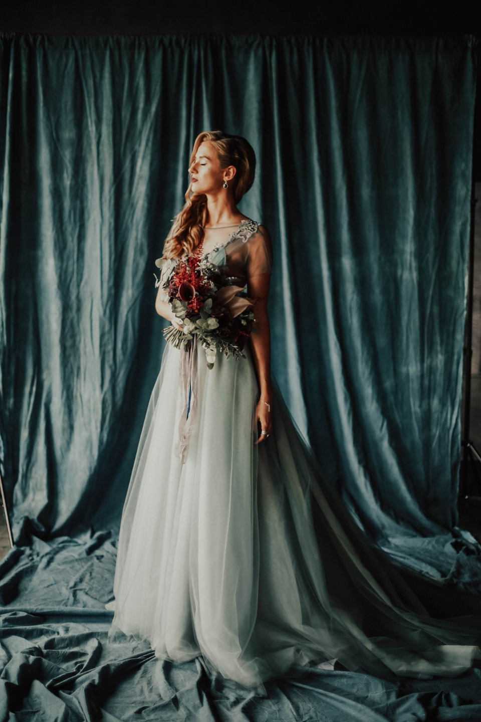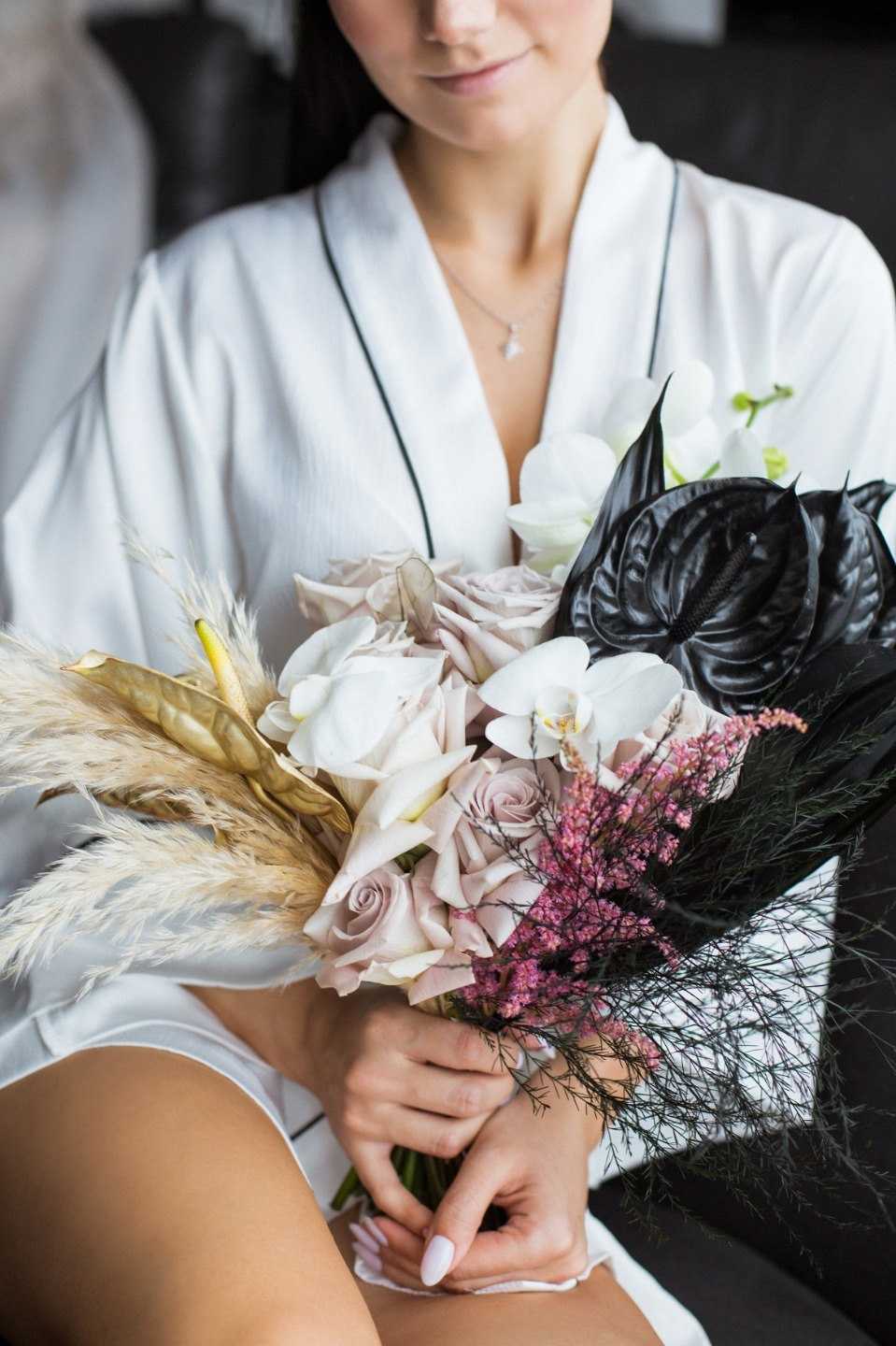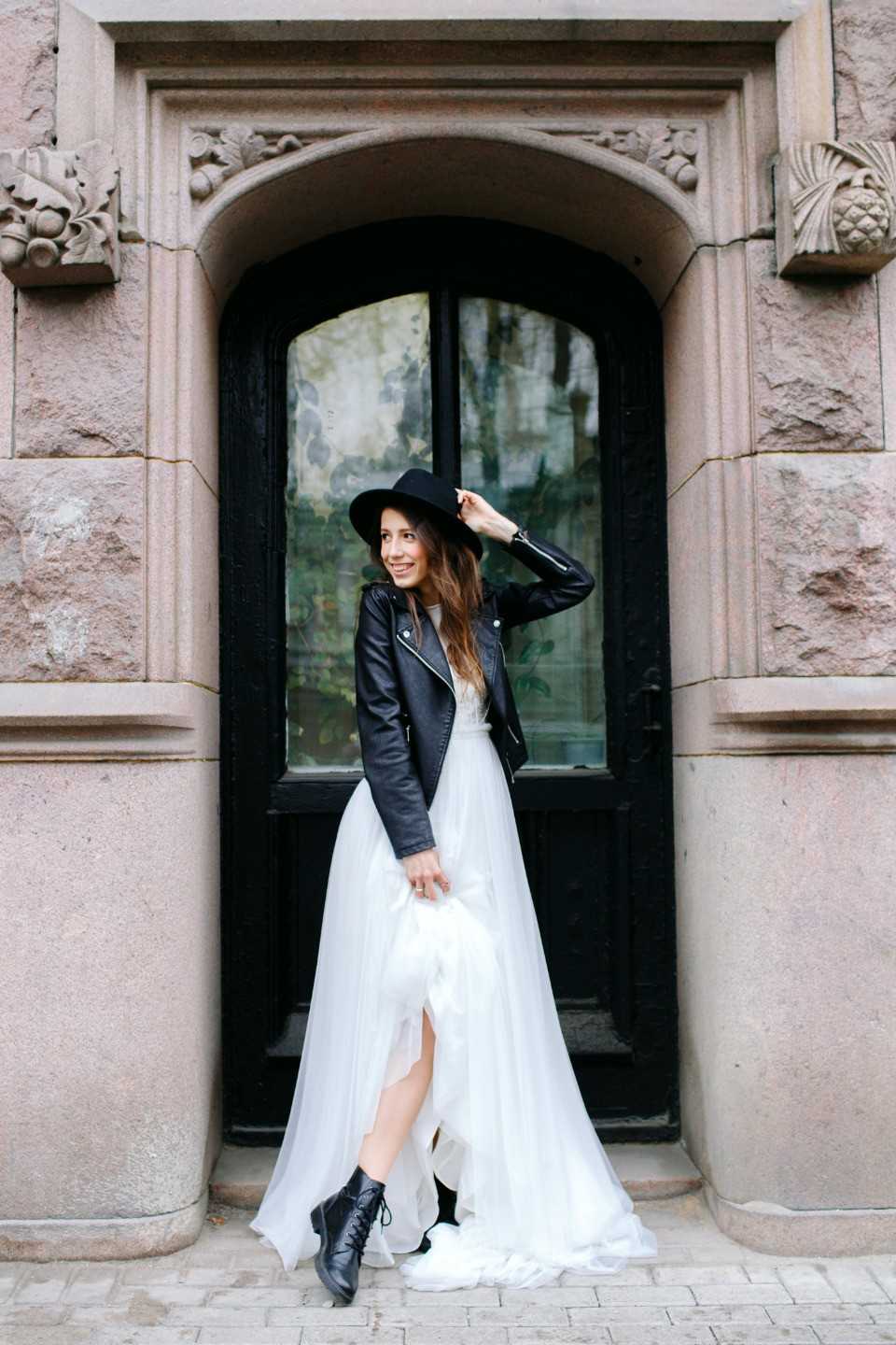 Основа стиля «урбан» в наряде невесты — необычный цвет или крой свадебного платья и игра на контрастах: например, джинсовка / кожаная куртка в сочетании с нежными, летящими тканями свадебного платья. Более сдержанный и элегантный образ строится на концепции минимализма, строгих линий, сдержанного шика: например, брючный костюм + туфли на шпильке, минималистичное платье из атласной ткани + объемные украшения.