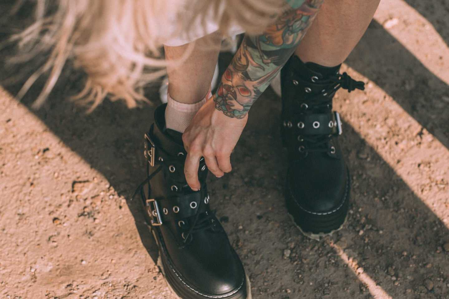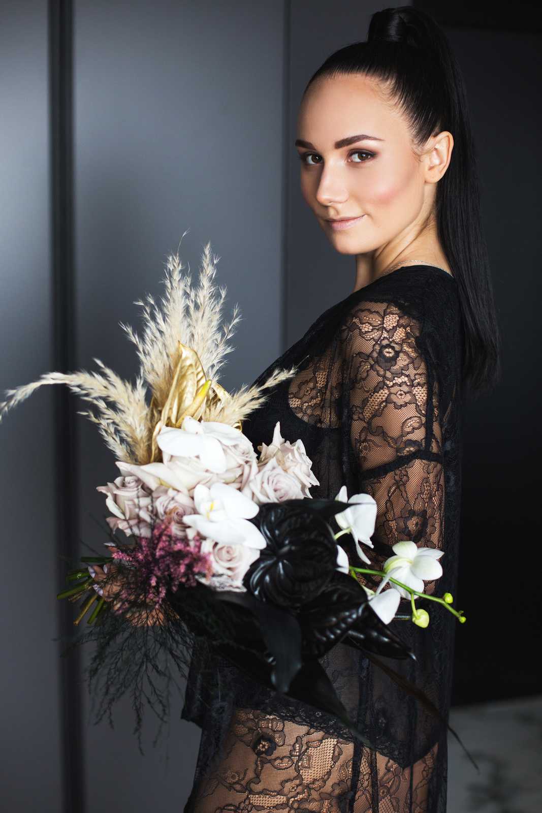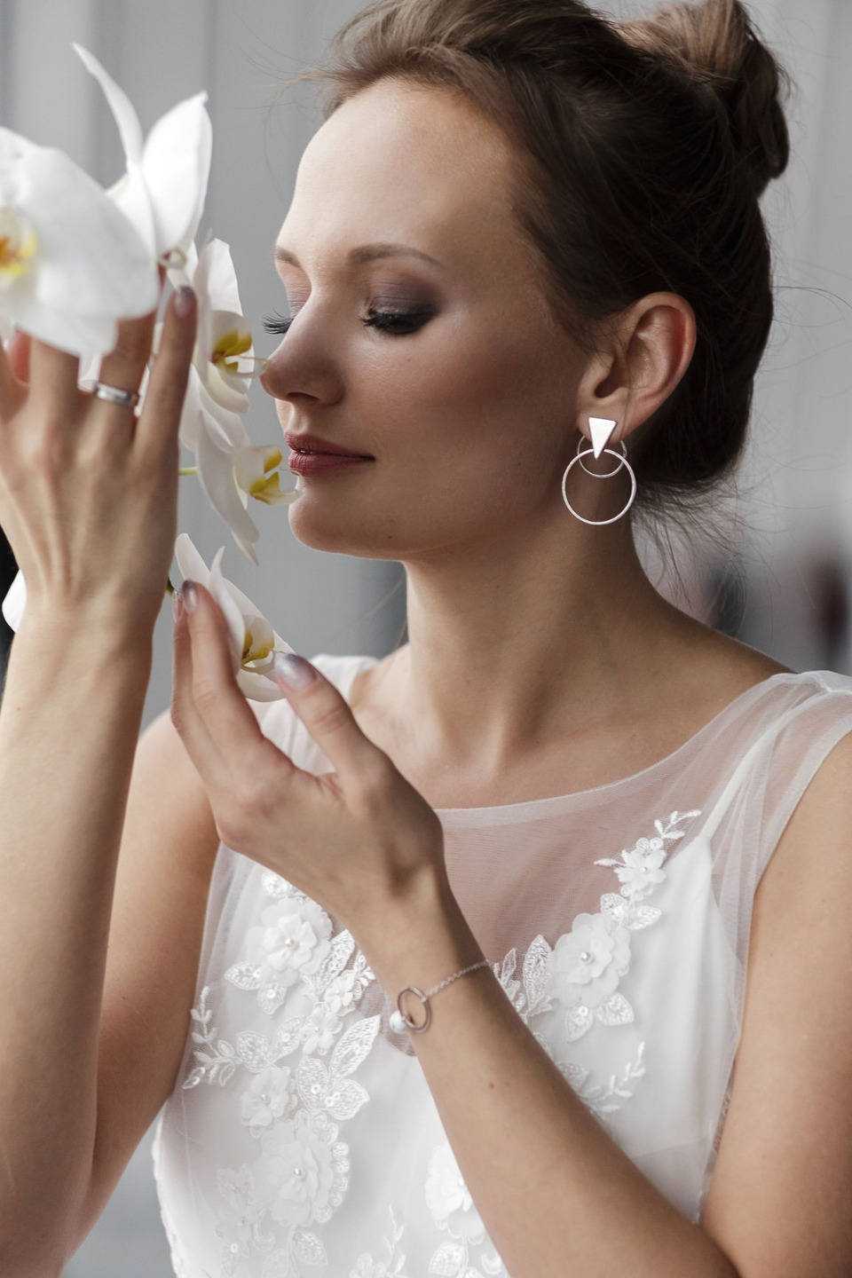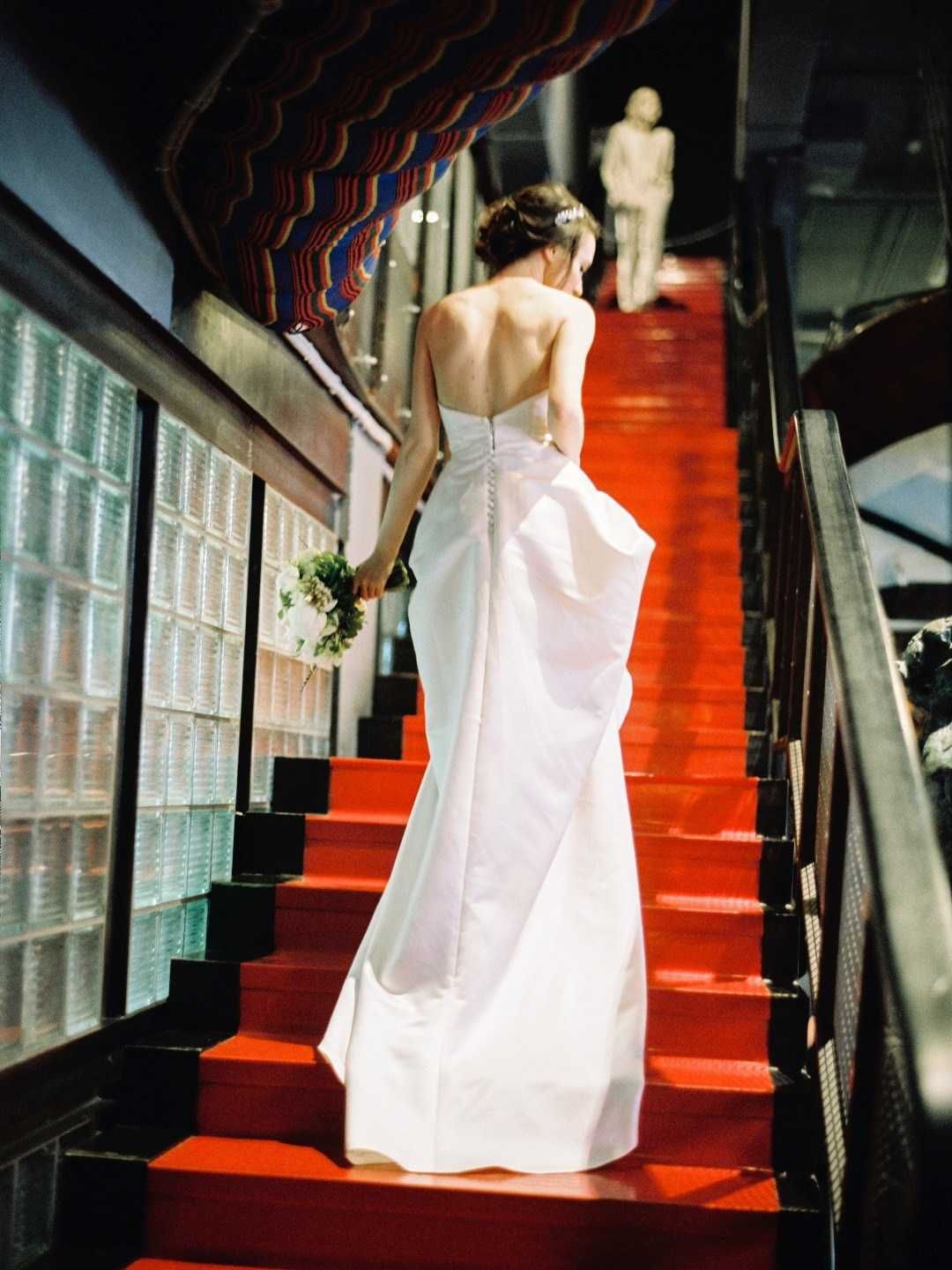 Основа стиля «урбан» в наряде невесты — необычный цвет или крой свадебного платья и игра на контрастах: например, джинсовка / кожаная куртка в сочетании с нежными, летящими тканями свадебного платья. Более сдержанный и элегантный образ строится на концепции минимализма, строгих линий, сдержанного шика: например, брючный костюм + туфли на шпильке, минималистичное платье из атласной ткани + объемные украшения.