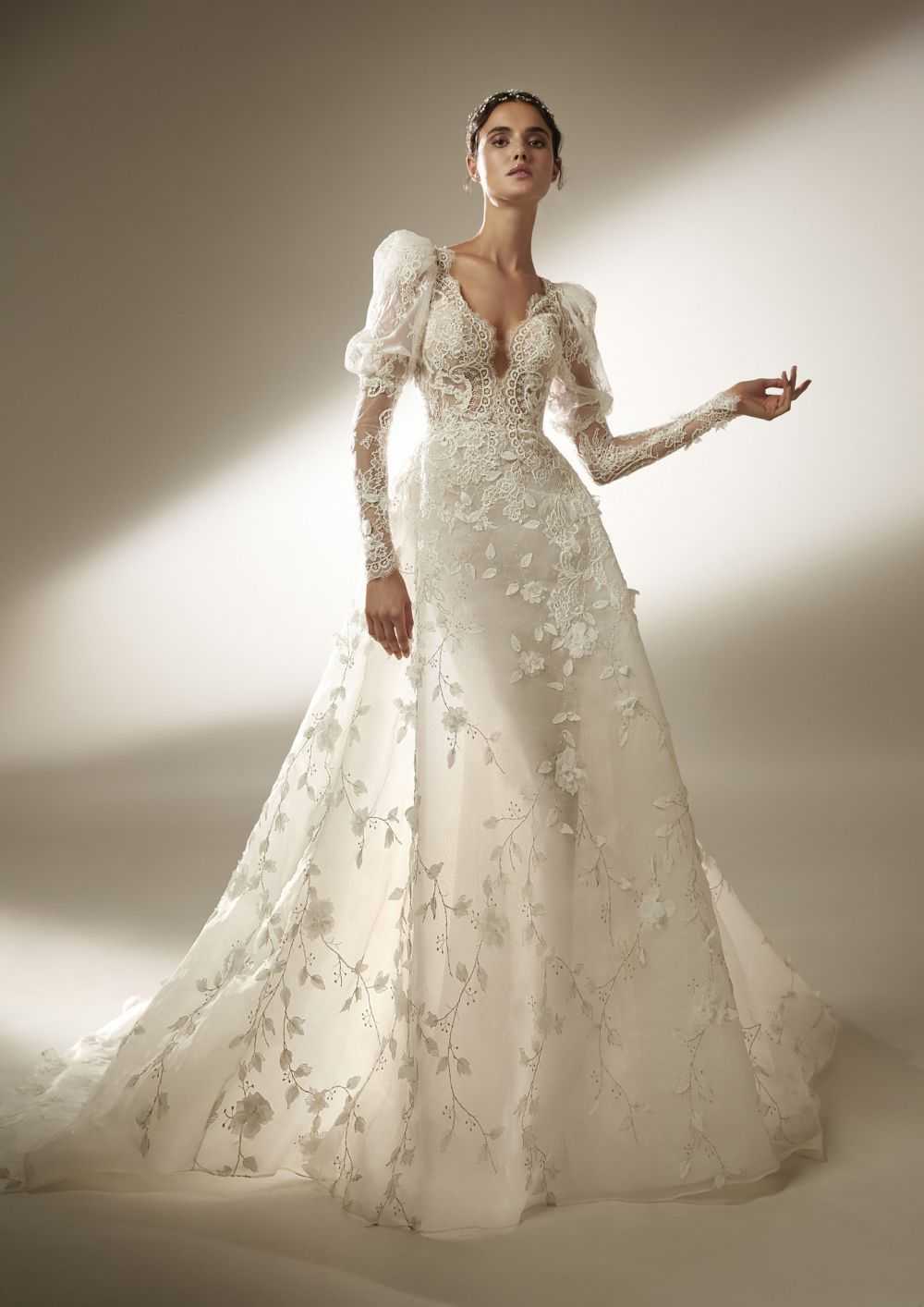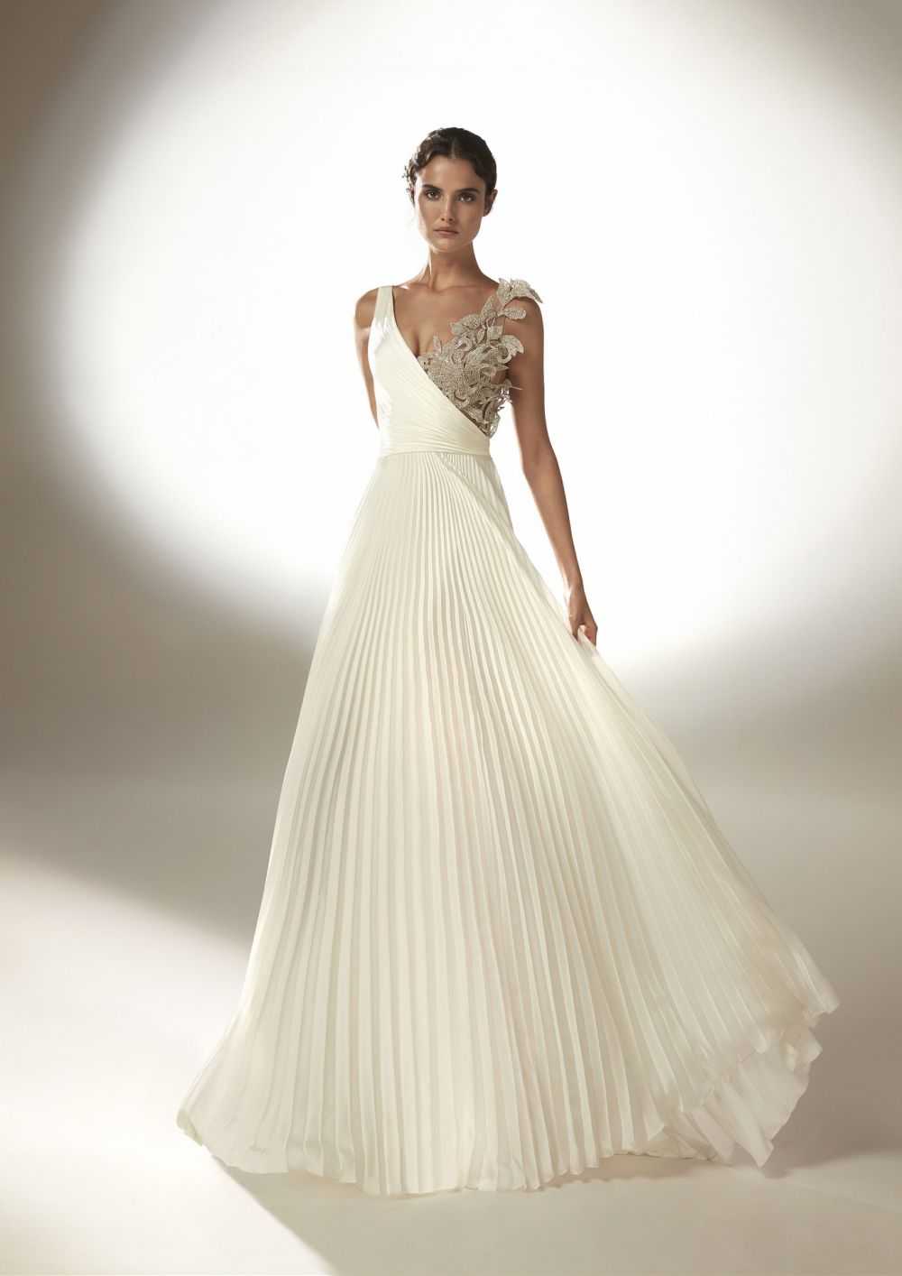 Если пышного торжества не планируется, это не означает, что невеста не может надеть длинное платье. Лаконичные модели с ниспадающими юбками в пол и оригинальным декором лифа будут уместны на росписи и на других праздничных мероприятиях, требующих вечернего наряда. Нежный нюдовый лиф и рукава в модели Viki Натальи Романовой украшены белоснежными лепестками и сочетаются с воздушной полупрозрачной юбкой из шифона с разрезом на ноге. Платье Asida от Armonia создает легкий летний образ благодаря лифу с американской проймой и струящейся шелковой юбке в пол с вертикальными складками.