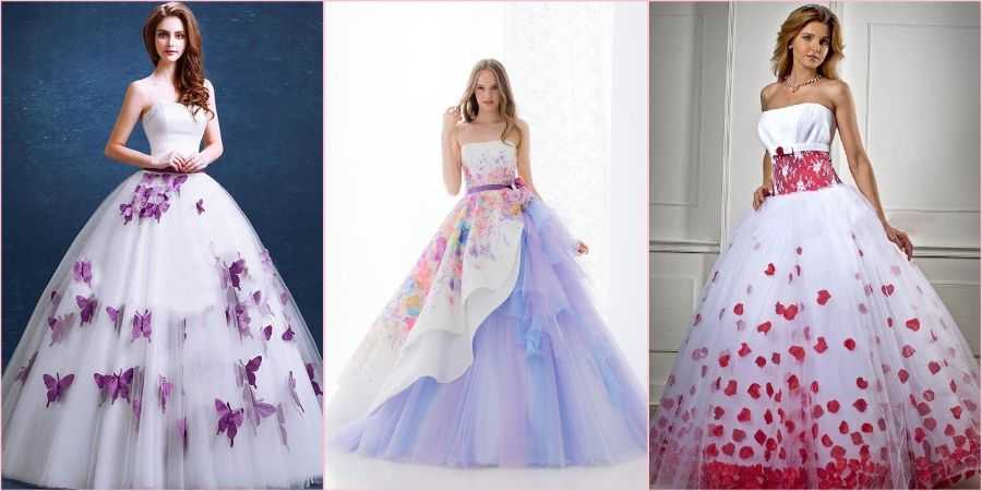 Популярными становятся светлые платья в сочетании с цветной тканью, которой может быть оформлен низ, верх наряда или какие-то отдельные детали.