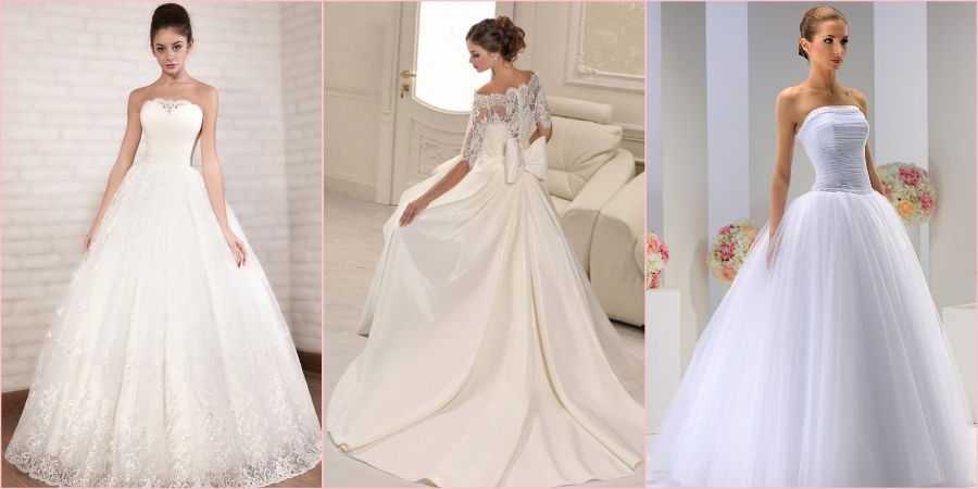 Белое свадебное платье с несъемным шлейфом может быть представлено в следующих вариантах: