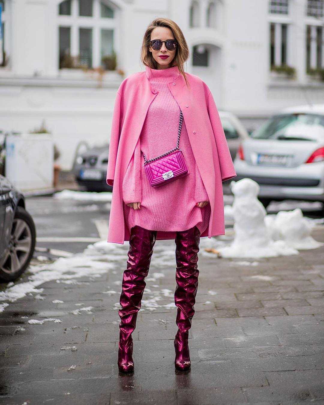 Образ, идеальный для прохладной погоды. Длинные бордовые ботфорты оттеняют коралловое платье, дополненное коротким пальто этого же цвета.