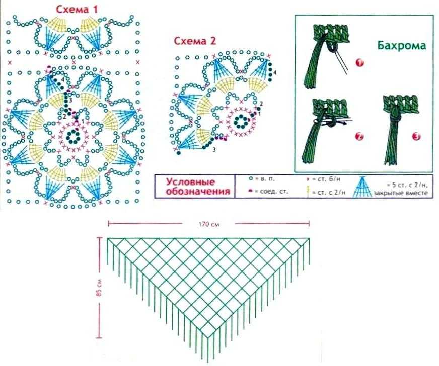 Для начала ознакомьтесь со схемами вязки шали, условными обозначениями. Рисунок изделия составляют 4 диаграммы: