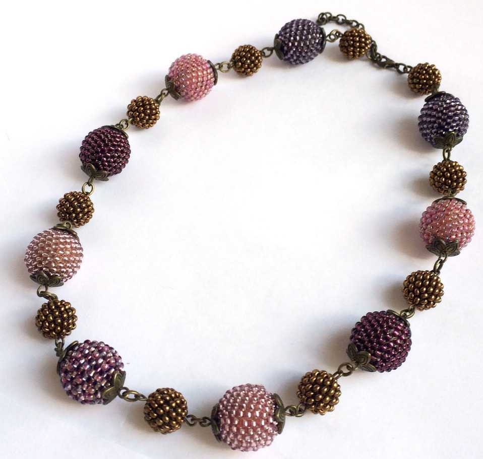 Следующий мастер-класс будет посвящен технике плетения объемной бусины. Рассмотрим ее на примере колье из бисера «Ежевика».
