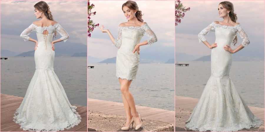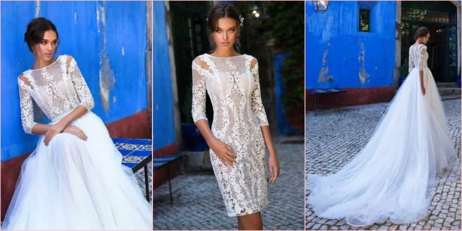 Некоторые модели шьются со съемным «хвостом» и шлейфом. Подобные трансформеры удобны, если невеста хочет на самой церемонии присутствовать в пышном наряде, а на банкете или на второй день свадьбы остаться в более комфортном наряде. Когда нижняя часть отстегивается, остается удобное, но не менее красивое платье-футляр.