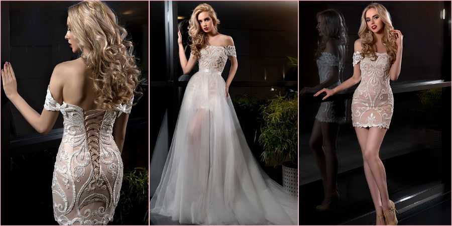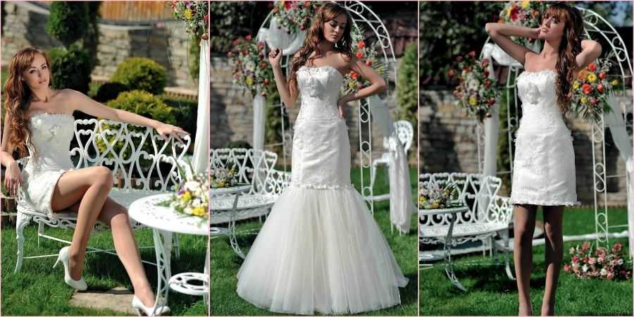 Самым распространенным вариантом является очень пышный наряд в пол. Ведь все девушки хотят в свой свадебный день выглядеть нежно и женственно, но не всем захочется ходить с утра до вечера в неудобном длинном платье с обручами. Именно для таких новобрачных создано изделие с отстегивающейся объемной макси юбочкой, которое с легкостью превратится в удобное и модное коктейльное платьице.