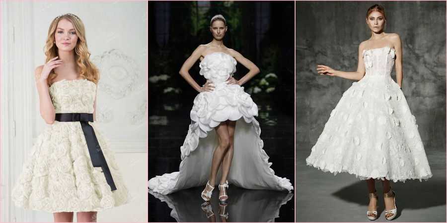 Рассматриваемые модели часто декорируют кружевом или гипюром, 3D цветами, пайетками, вышивкой, жемчугом, стеклярусом, блестящим или атласным пояском.