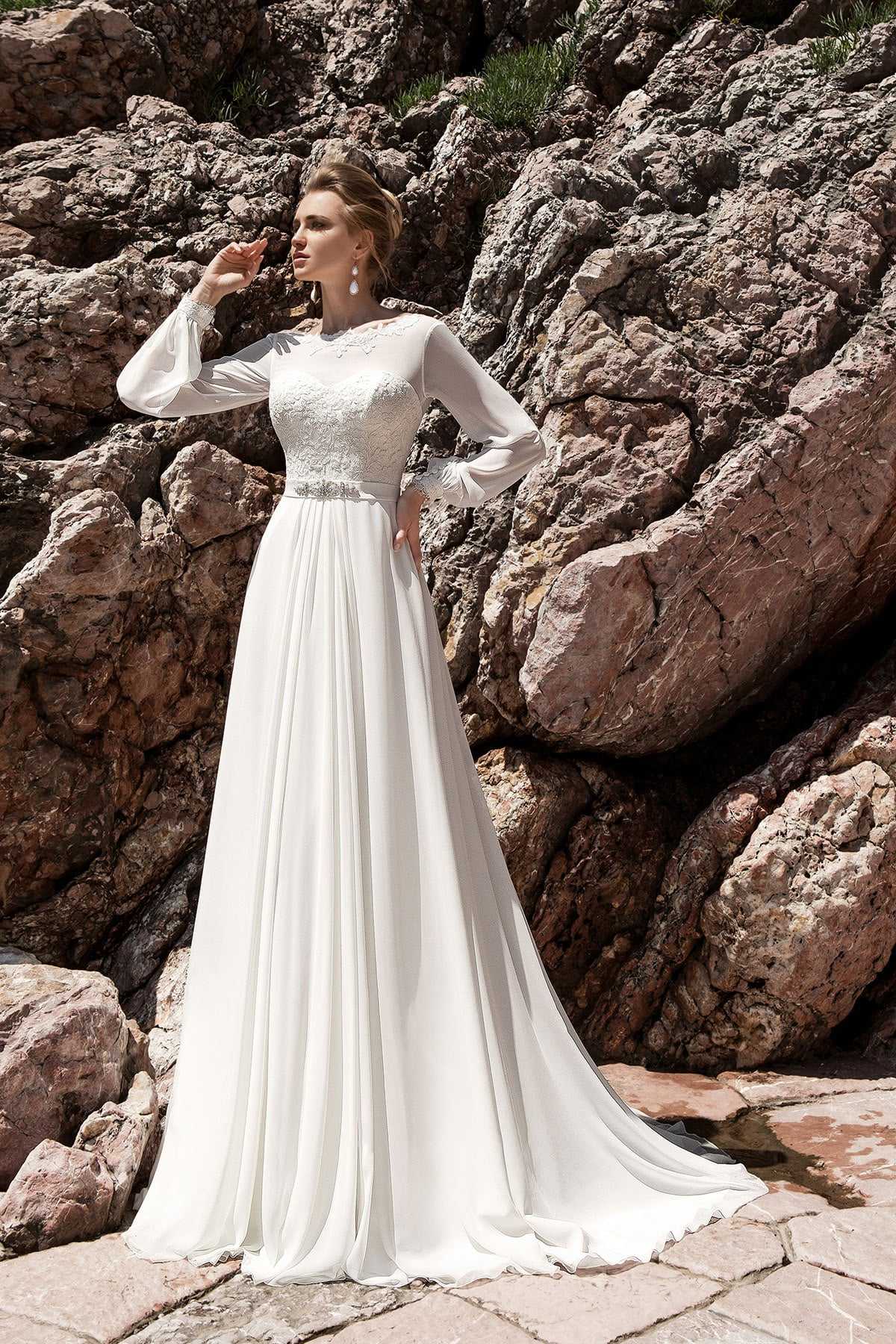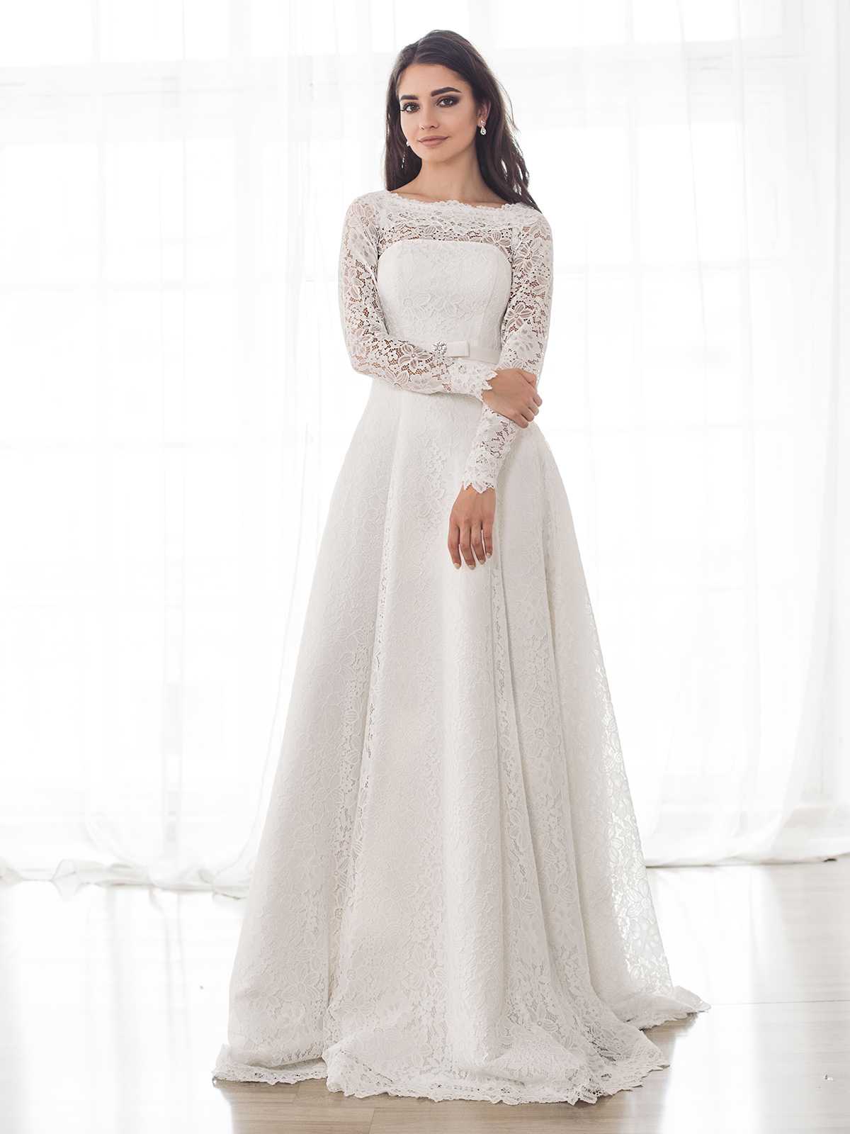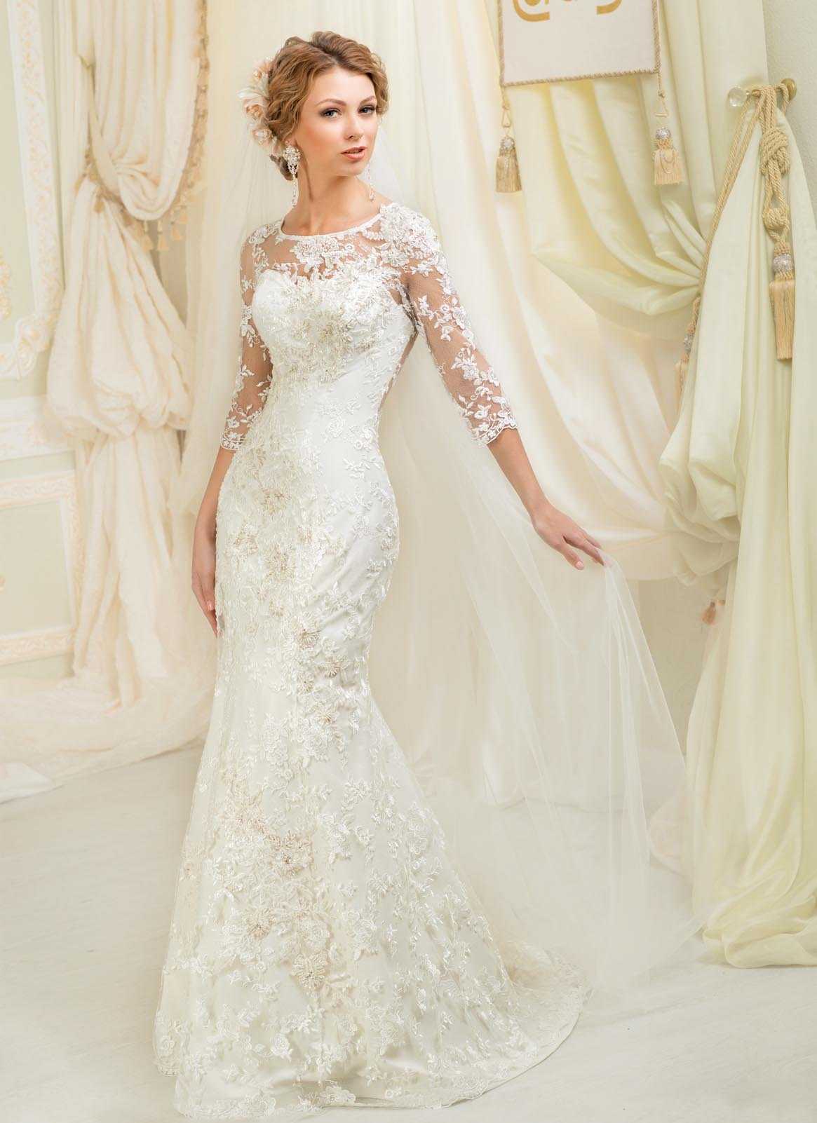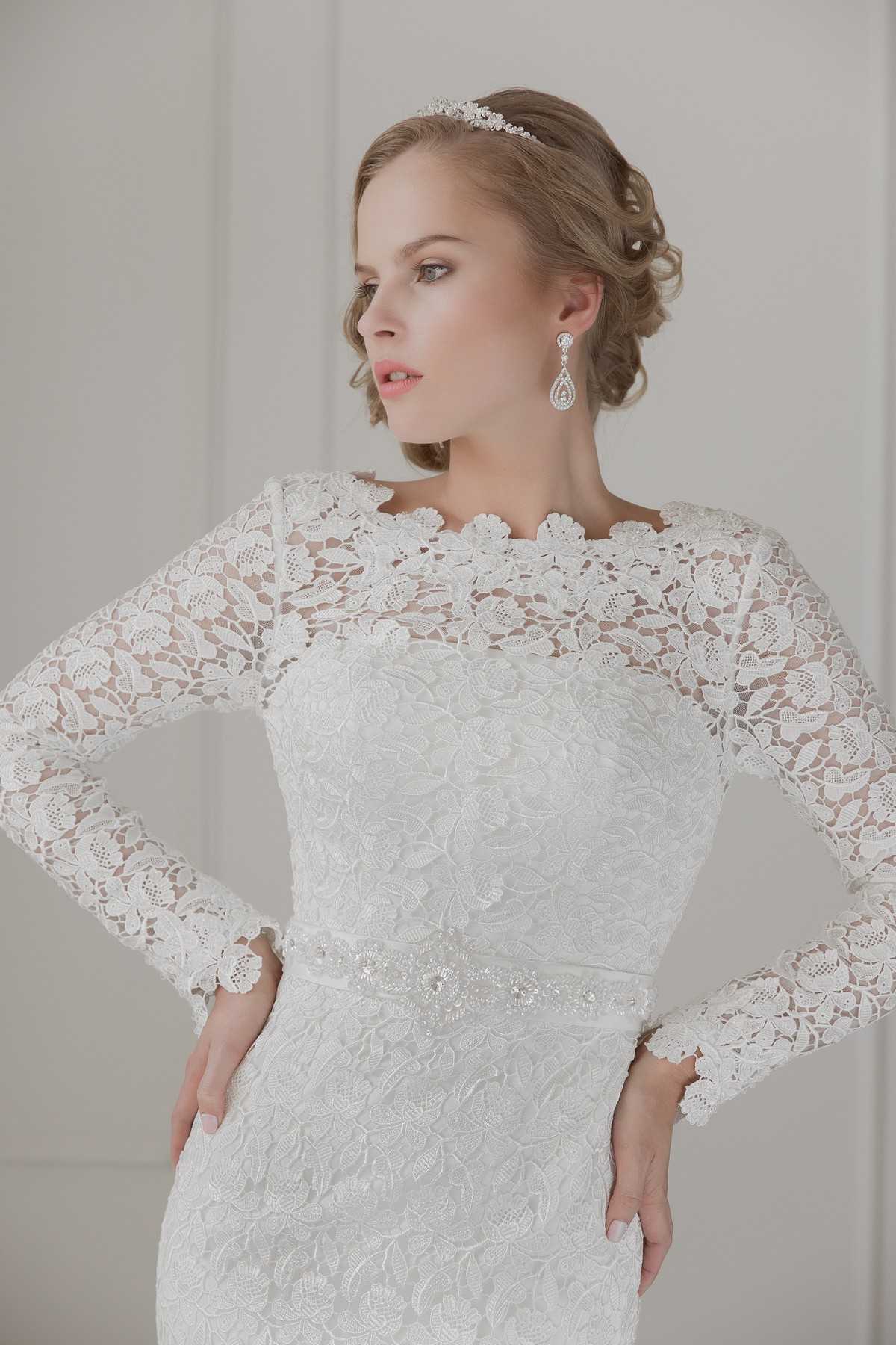 Великолепно выглядят закрытые варианты для свадьбы, которые состоят из шифона или шелка. Часто в качестве декора используются ажурные вставки из гипюра, подчеркивающие закрытую спину и плечи, а также рукава модели. Горловина уходит вверх, образуя небольшой воротничок, облегающий полностью шею. Плотный лиф немного просвечивается, поскольку рукава и зона декольте имеют прозрачную текстуру. В основном закрытое платье всегда имеет приталенный силуэт, который повторяет контуры фигуры.