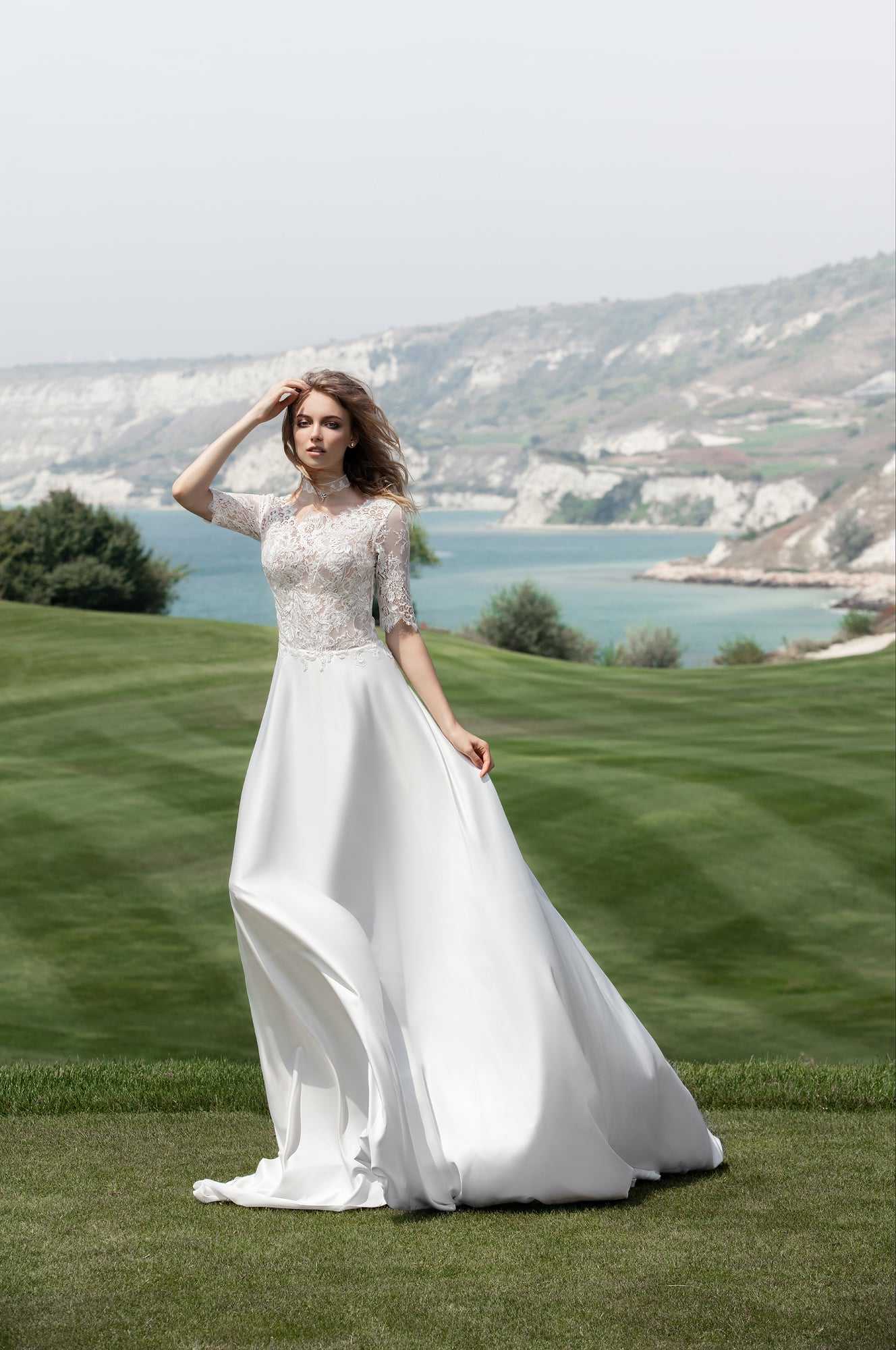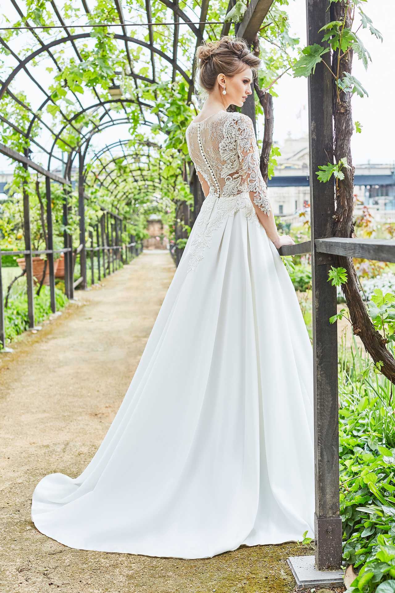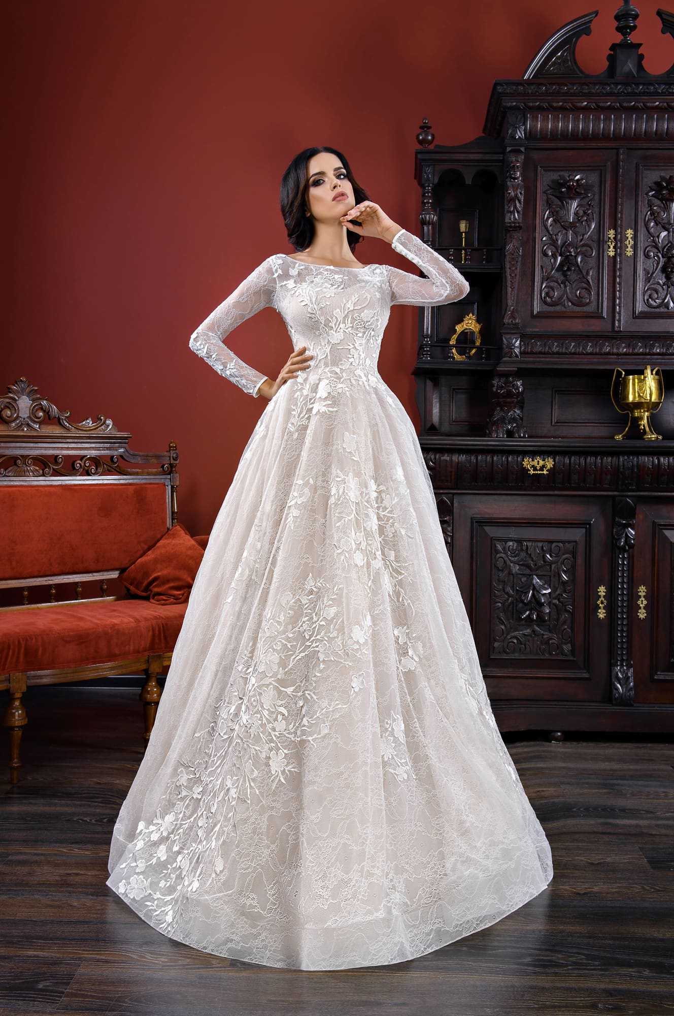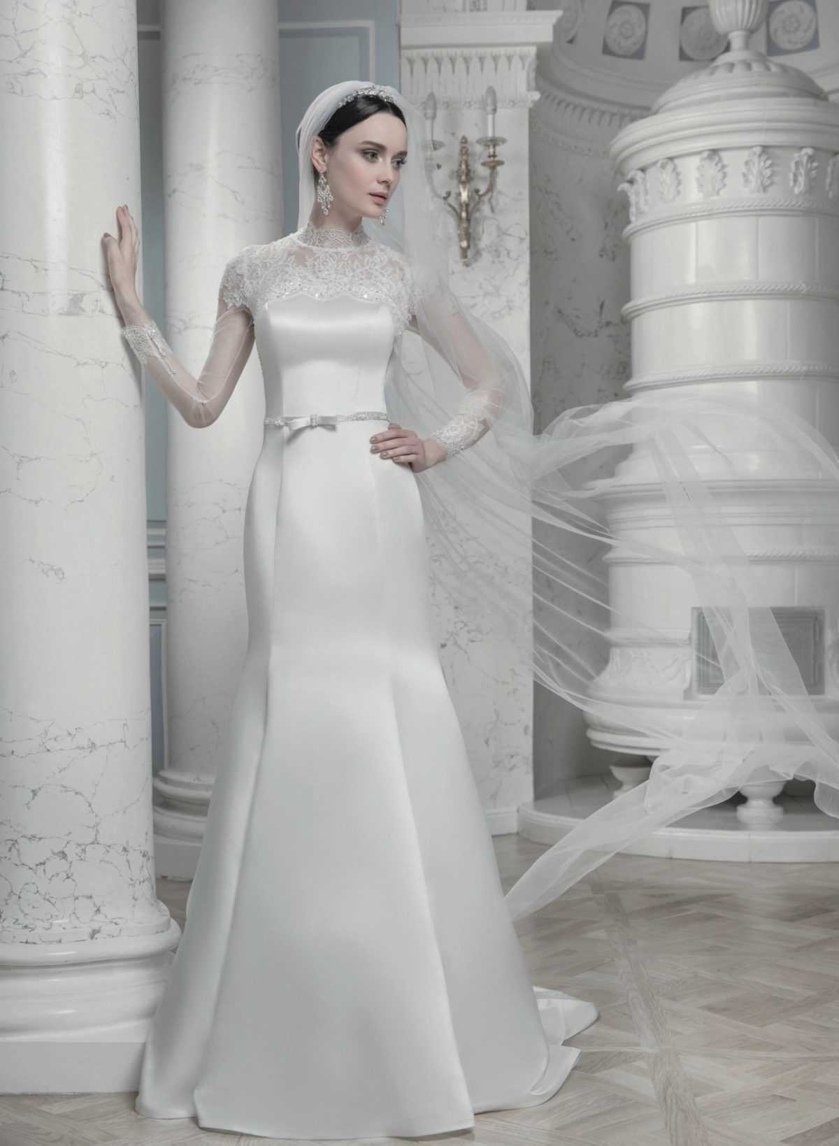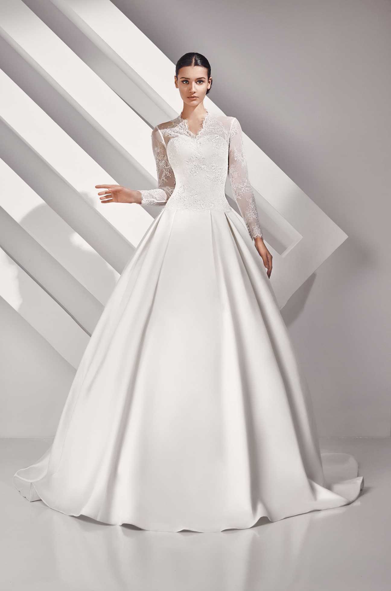 Великолепно выглядят закрытые варианты для свадьбы, которые состоят из шифона или шелка. Часто в качестве декора используются ажурные вставки из гипюра, подчеркивающие закрытую спину и плечи, а также рукава модели. Горловина уходит вверх, образуя небольшой воротничок, облегающий полностью шею. Плотный лиф немного просвечивается, поскольку рукава и зона декольте имеют прозрачную текстуру. В основном закрытое платье всегда имеет приталенный силуэт, который повторяет контуры фигуры.