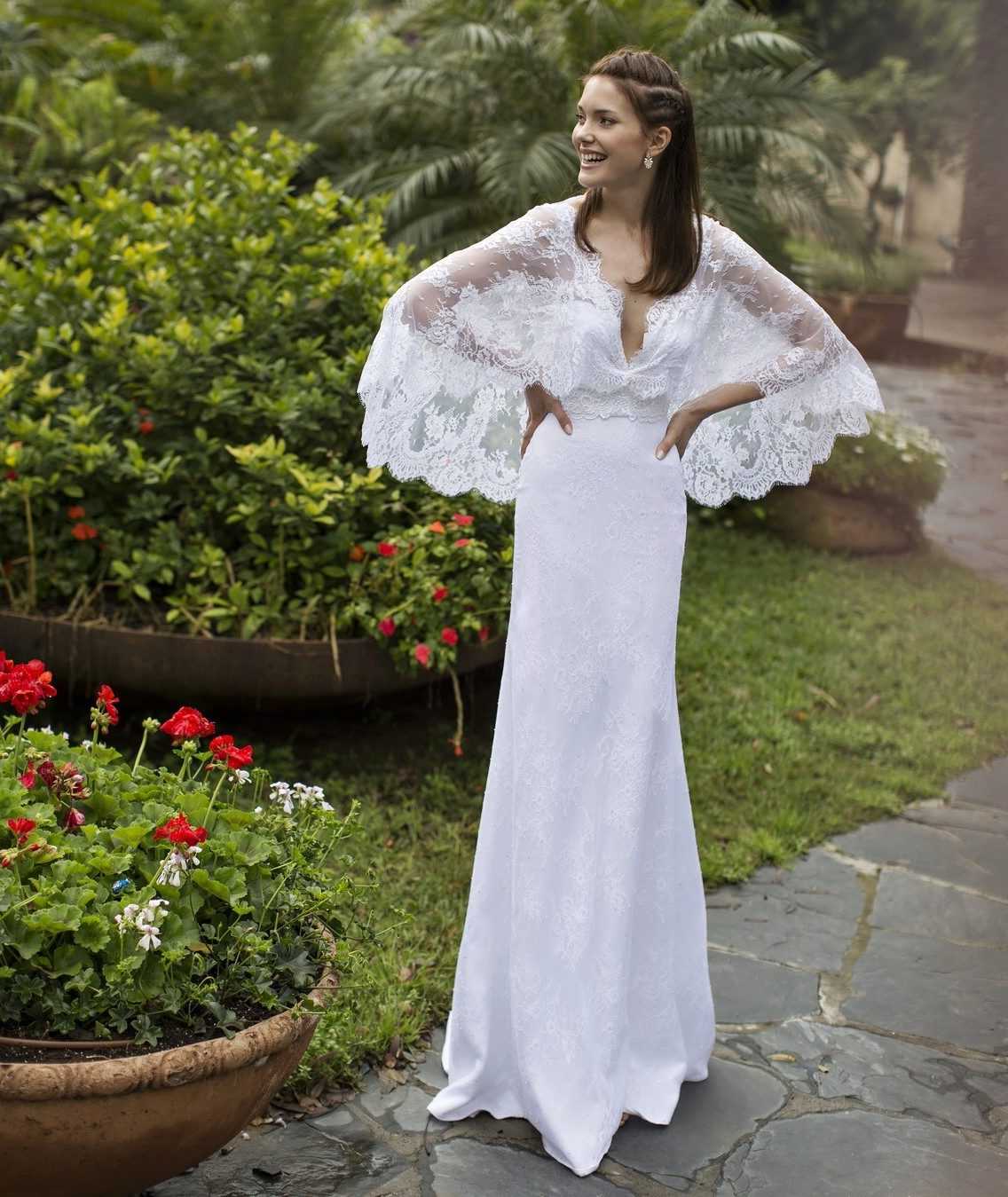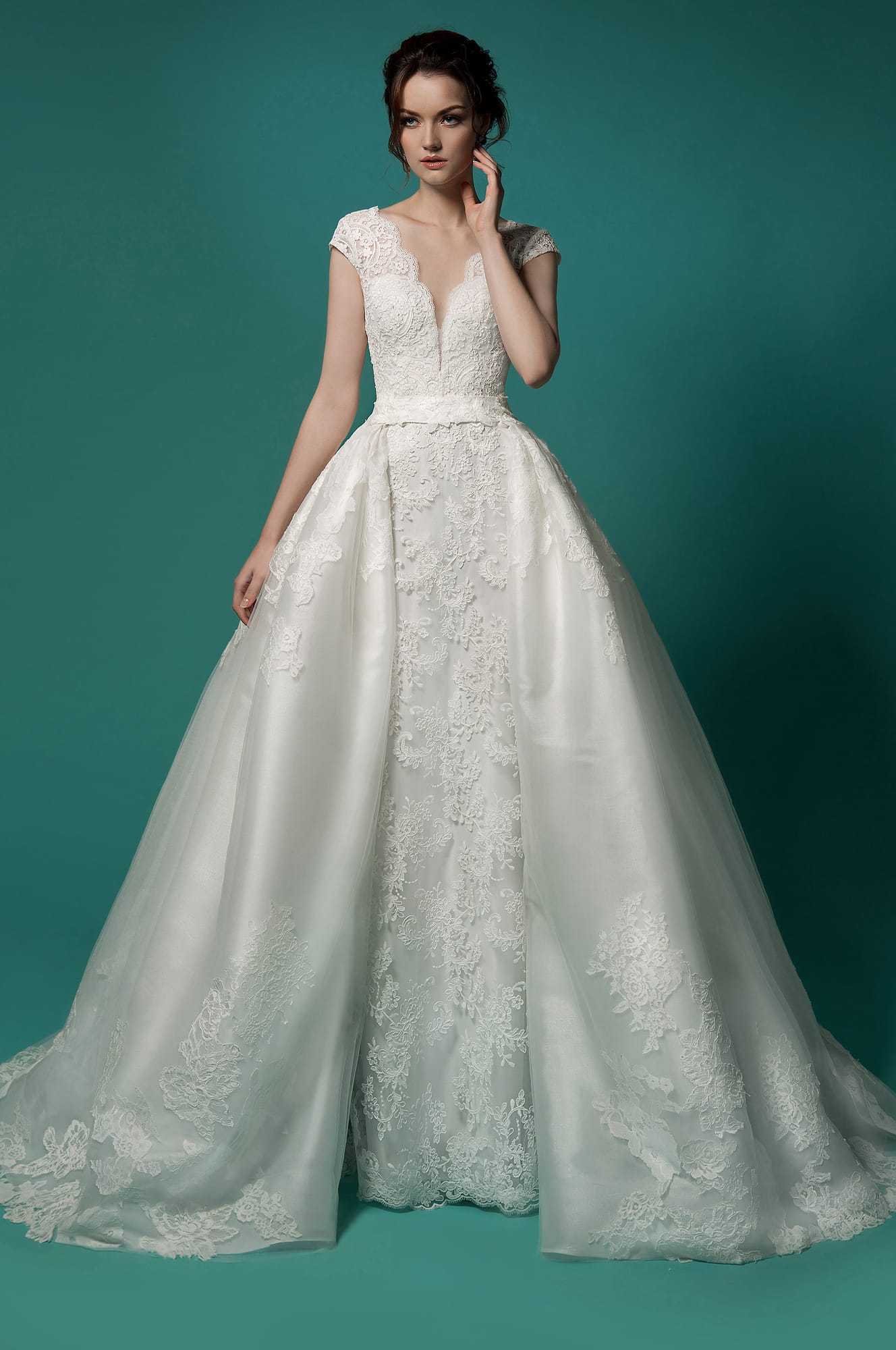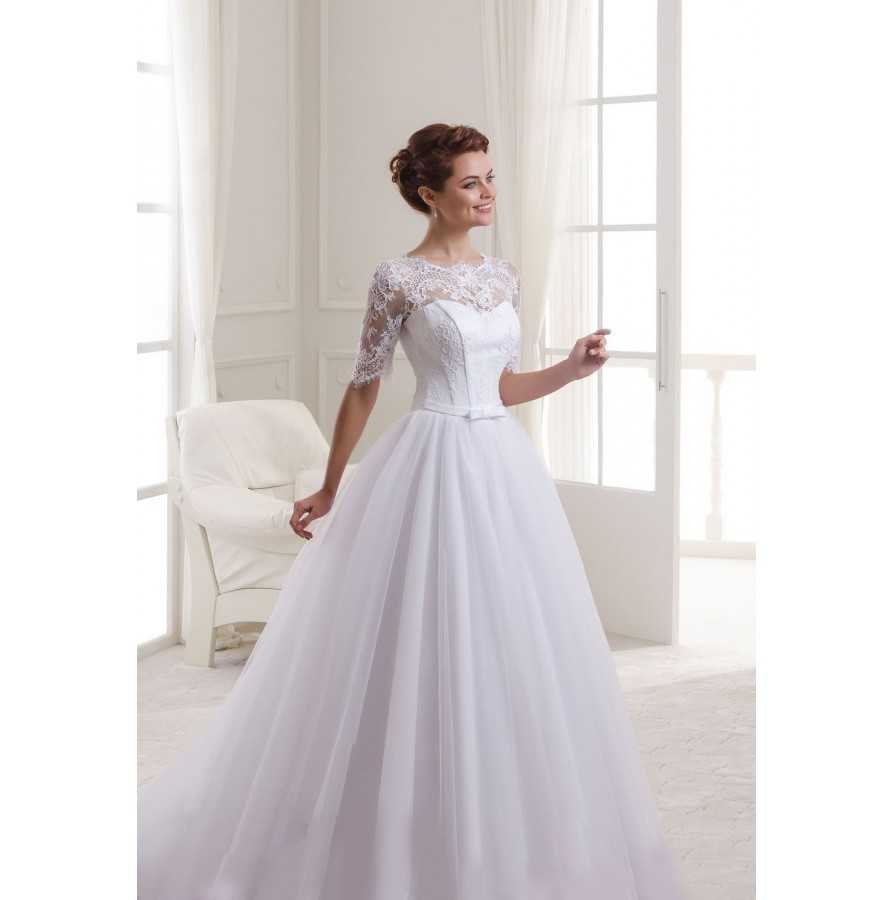 Свадебные платья со спущенными кружевными рукавами короткой длины