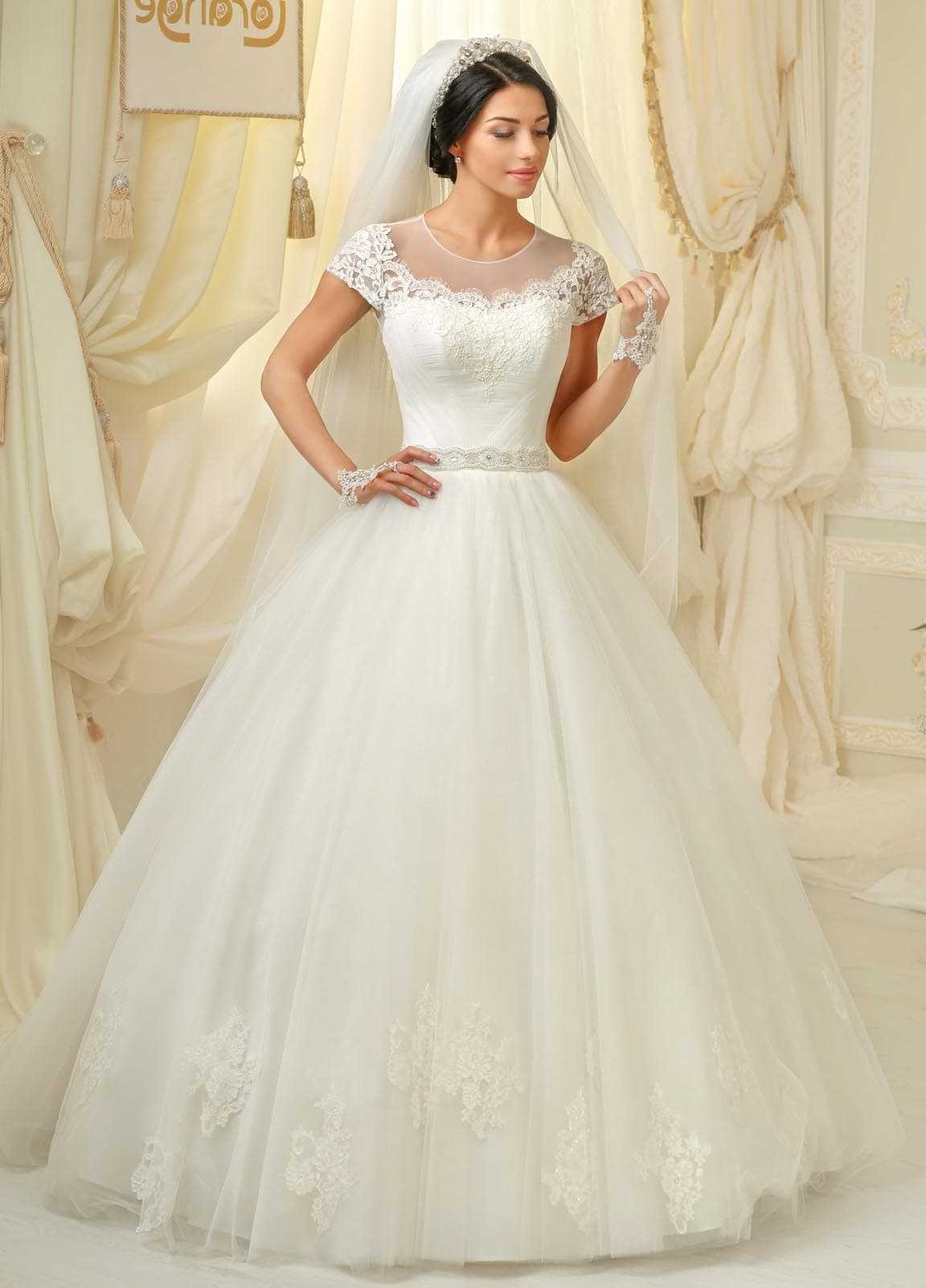 Бальные пышные наряды. Почувствует себя принцессой из сказки девушка в пышном платье с многослойными юбками, плотным корсетом и кружевными рукавами. Использование дорогих тканей, акцент на линии талии и обтягивающий лиф – превратят свадьбу в королевское пиршество. Бижутерию используют по минимуму, допускается комплект дорогих строгих украшений. Лучше остановиться на простой однослойной фате и тонкой тиаре.