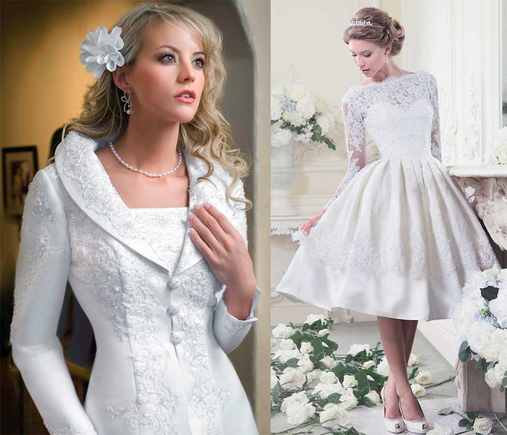 Укороченные платья. Юные невесты предпочитают укороченные свадебные платья с закрытой спиной, не сковывающие движения. Фасон подойдет для свадьбы в стиле ретро или винтаж. Задрапированный легкой тканью в зоне декольте и спины наряд дополняют шляпкой-вуалеткой, перчатками, поясом и туфлями на шпильке. Подойдут неброские аксессуары для создания образа воздушной невесты.