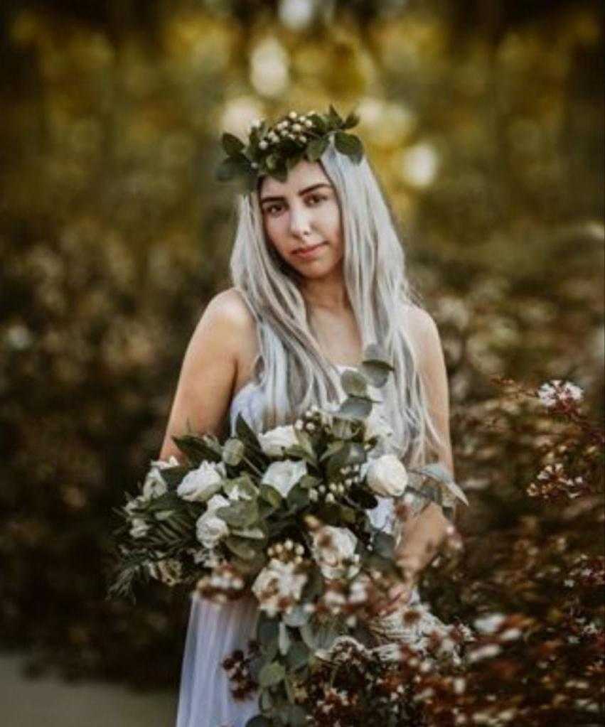 Второй – эффектное сочетание сочной зелени растений разных оттенков с белоснежным платьем и фатой.