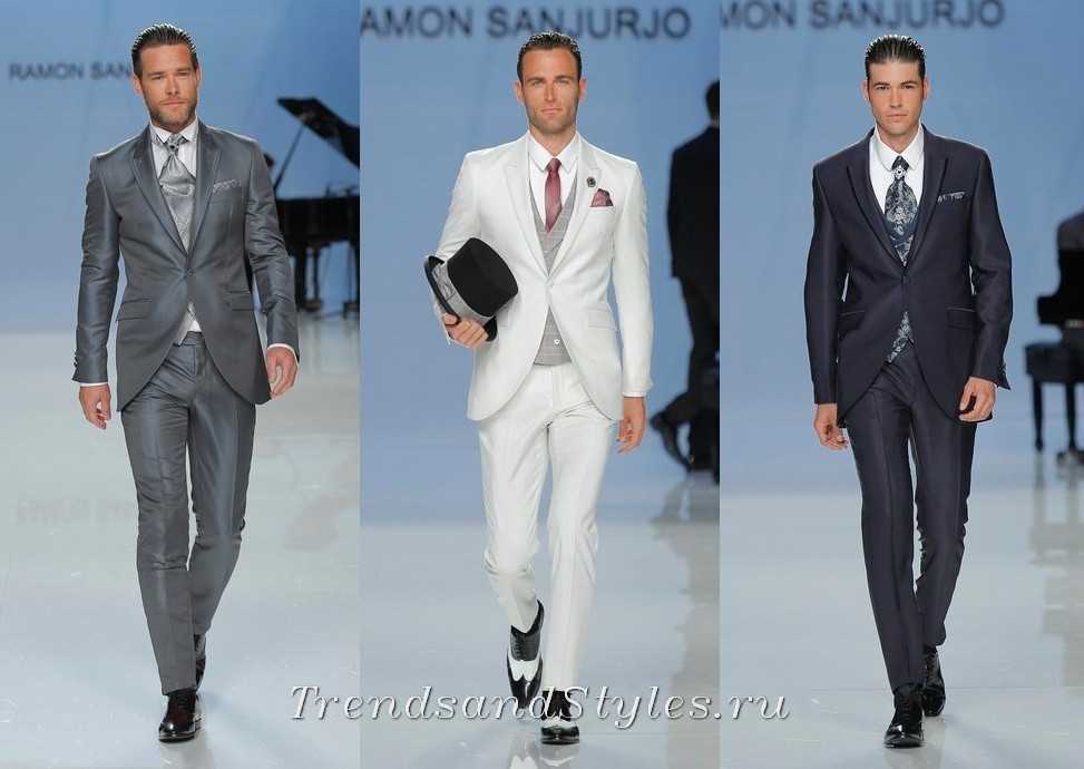- белый – замечательный цвет, который идеально подойдет брюнетам с загорелой кожей. Но стоит учитывать один момент, не выбирайте эту расцветку, если невеста планирует одеться в платье «айвори», ведь в таком случае ее наряд рядом с мужским белоснежным костюмом будет выглядеть «грязно». А вот если у новобрачной нежно-розовая или светло-голубая одежда, то белый в образе будущего супруга даст отличное сочетание с луком девушки;