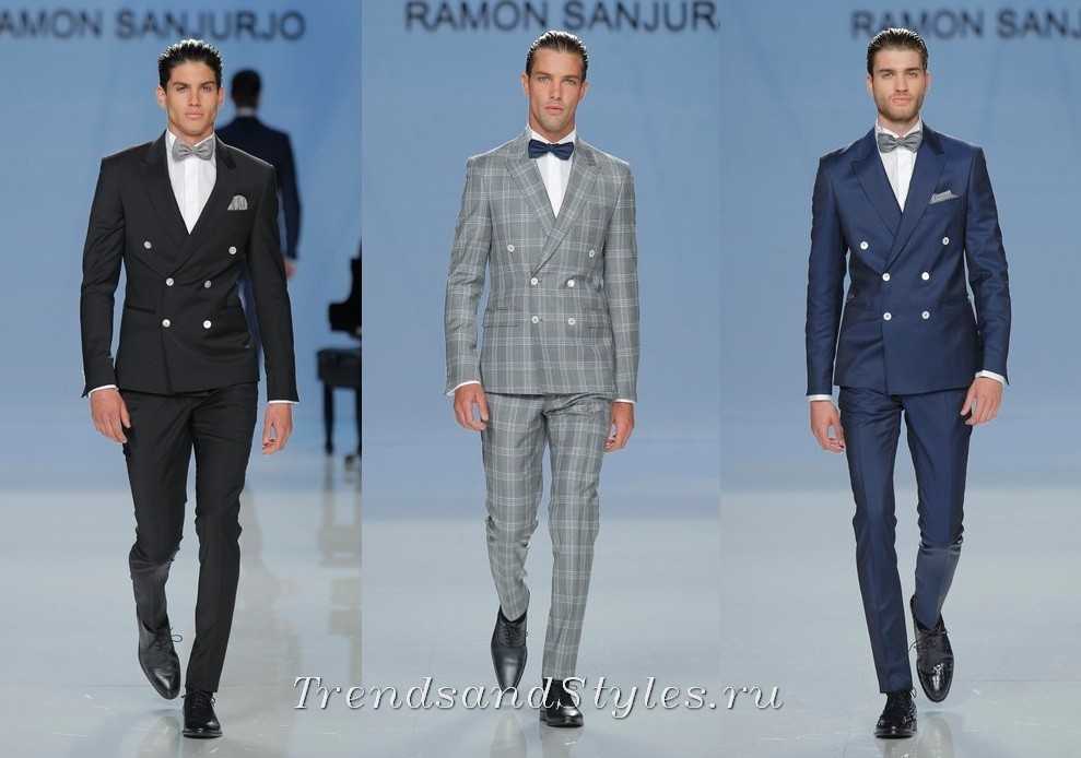 Традиционные свадебные фраки — важная часть коллекции Рамона Санджурджо . Классические черные костюмы в этом году дополняют цветными клетчатыми жилетами и контрастными аксессуарами: галстуком или бабочкой, платком Дизайнер предлагает не останавливаться на однотонном образе жениха, чтобы внешний вид был не только сдержанно-лаконичным, элегантным, но и интересным. В костюмах тройках предлагает одну вещь вводить в узор. Обычно — это клетка шотландка, подобранная в тонах всего наряда: в сером или синем цвете. Все-таки классика остается главенствующим элементом в столь важный день.