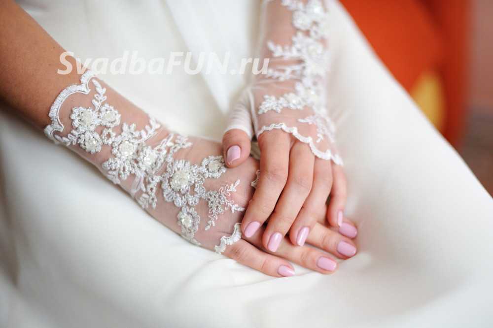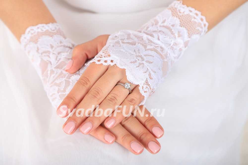 Свадебные перчатки, изготовленные с использованием кружева, сделают образ невесты элегантным и нежным. Сочетается такой фасон с любой моделью платья, и не имеет значения из какой ткани оно изготовлено. Идеально смотрятся, если украшены мелкими стразами или камушками с разноцветными отблесками.