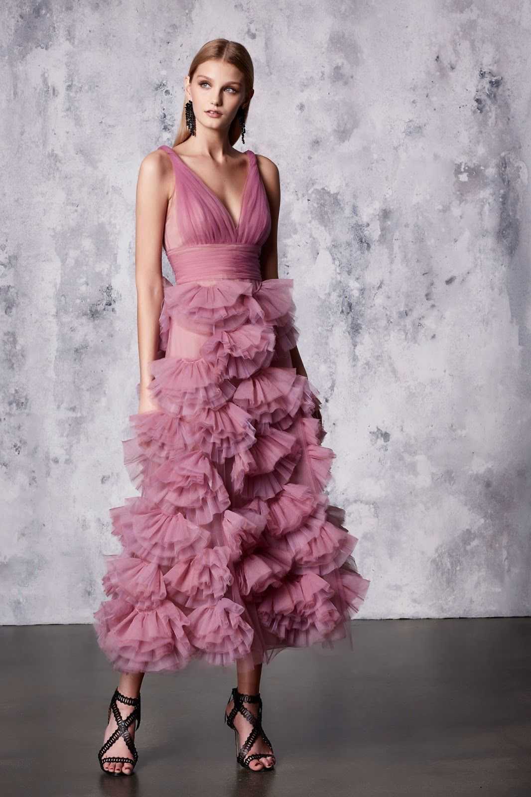 Интересная модель вечернего платья показана среди работ Marchesa Notte. Это фасон маллет с глубоким вырезом и пышной многослойной юбкой ниже колен. Такая модель будет отлично смотреться с босоножками на шпильках. Из аксессуаров к ней подойдет лаконичный клатч.
