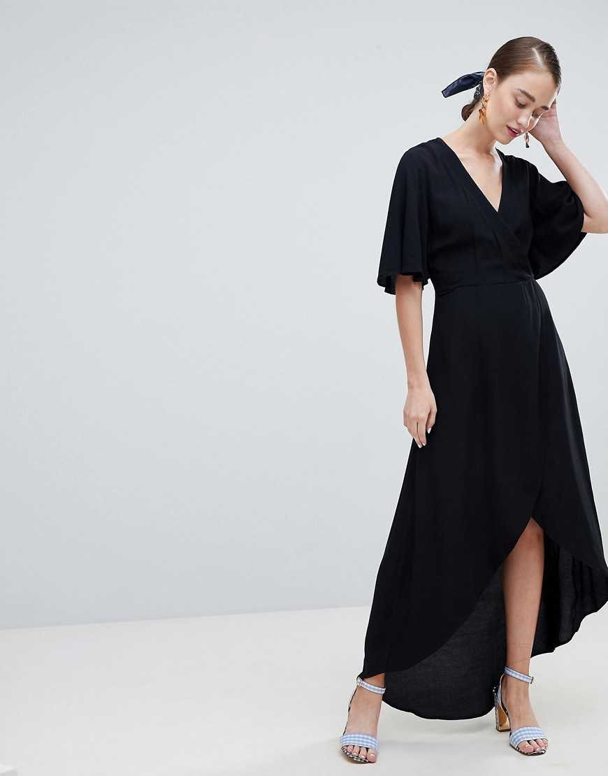 - однотонное изделие с V-образным вырезом, асимметричным подолом и объемными рукавами.