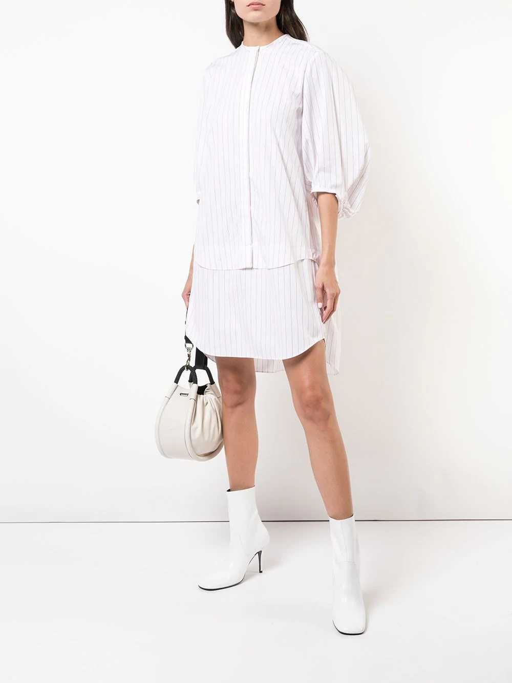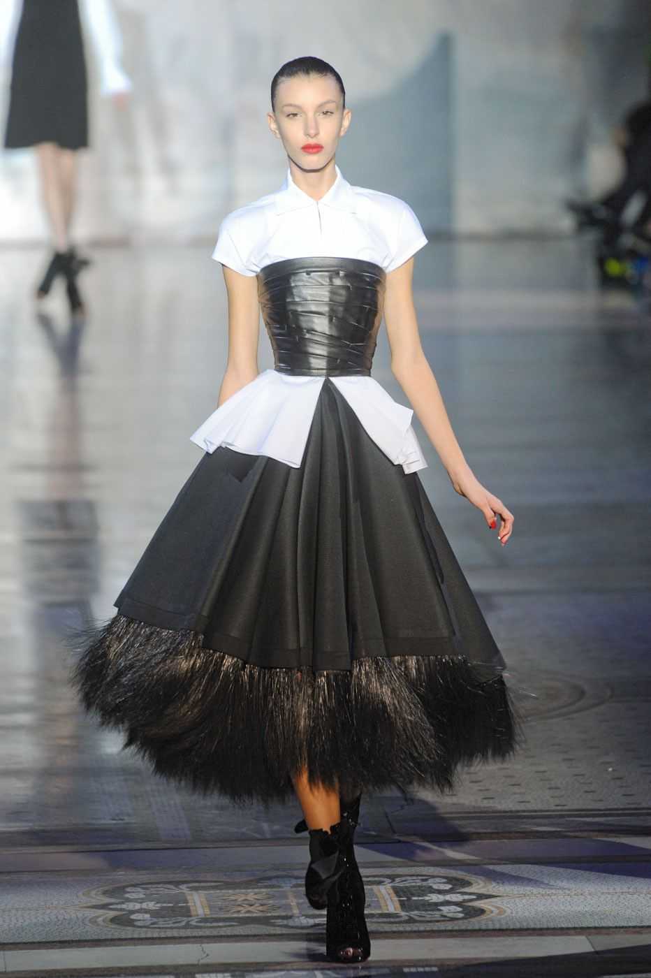 Прекрасная модель свободного силуэта представлена в коллекции Maison Rabih Kayrouz. Дизайнер предложил ее в белом варианте с широкими рукавами на завязках. В представленном луке платье сочетается с красными невысокими сапогами.