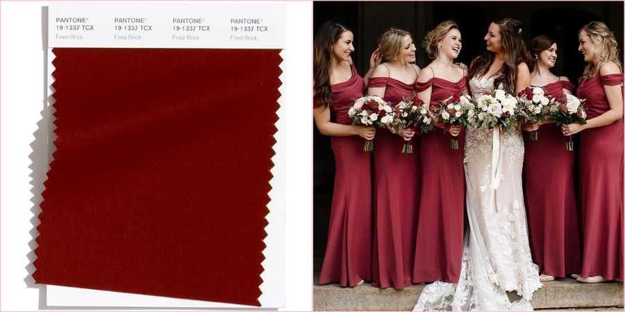Сочетание красного и коричневого подарило нам потрясающий «Fired Brick». Наверное, многим этот красно-коричневый цвет напомнит осенние опавшие листья, поэтому выбирая его на свадьбу во второй половине года, можете быть точно уверены, «Обожженный кирпич» замечательно впишется в Ваше торжество и сделает его модным.