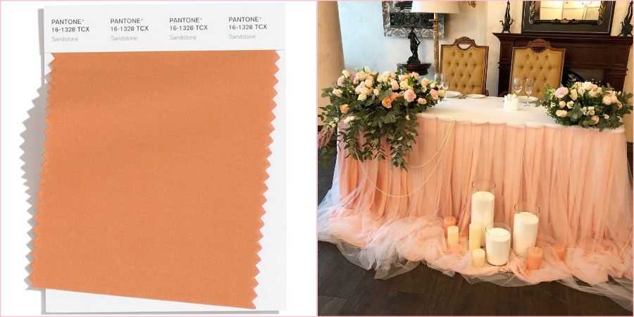 А вот эту расцветку уже можно смело назвать нюдовой, она чем-то напоминает осеннюю листву или же песочек на пляже, кому как больше нравится. Рассматриваемый песочный тон с розовым отливом замечательно впишется в любое свадебное торжество в сочетании с более яркими красками.