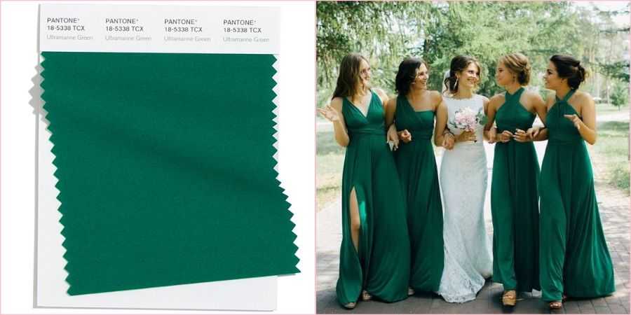 Прохладный «Ультрамариновый зеленый» получился с помощью двух цветов – зеленого и синего. Он очень красивый, благородный, глубокий, символизирует уверенность в себе. Великолепно будет смотреться и на осенней, и на зимней свадьбе.