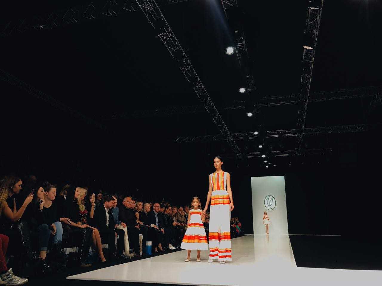 На фото сверху модель в трапецевидном платье с контрастным ремнем, яркими полосами разного направления и воротником-хомутом, на фото снизу образец детского фольклорного платья в красно-золотую полоску с завышенной талией, а также женский комбинезон с широкими брюками и вышитым топом.