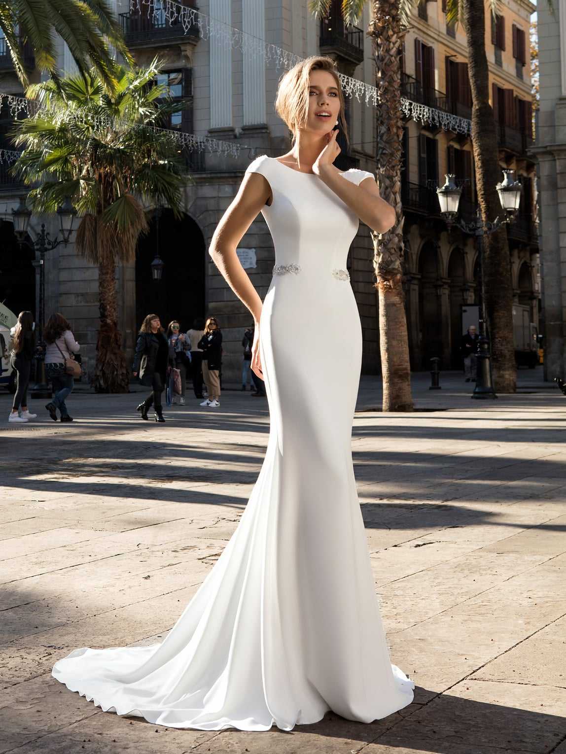 Преимуществом лаконичного платья-футляра является то, что в нем можно появиться не только в ЗАГСе и на торжественной части, а и на венчании в церкви.