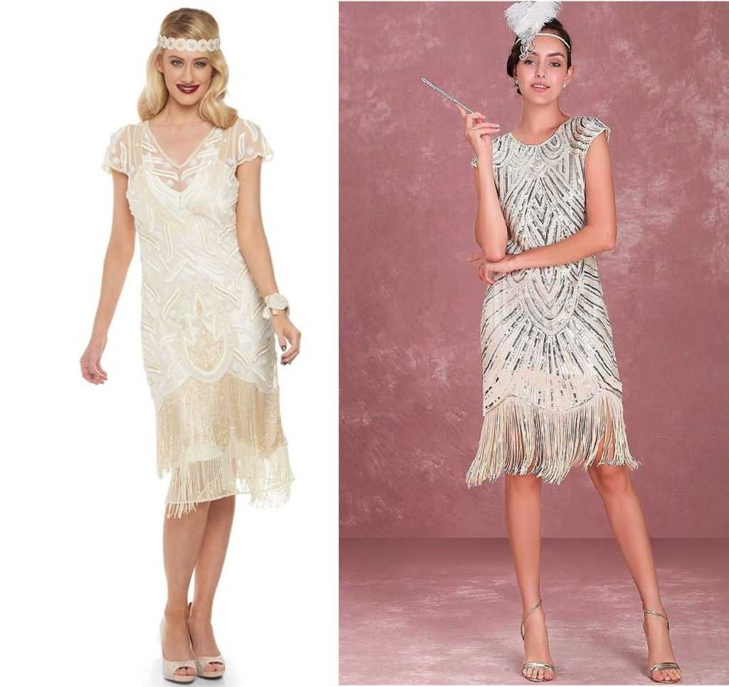 Любительницам импровизации и джаза пойдёт платье в стиле Гэтсби. Хулиганское мини прямого кроя из фактурной ткани, часто с бахромой, можно дополнить небольшой шляпкой. Подойдут также лента или другое оригинальное украшение для волос. Цвет наряда может быть не только белым, но и кремового или даже серебристого оттенка.
