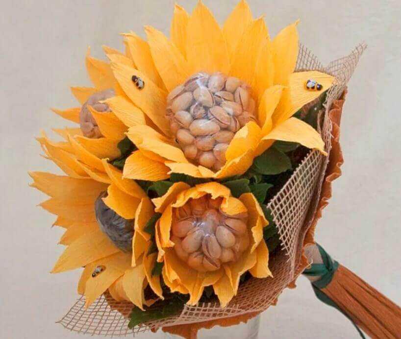 Целые фисташки и арахис можно преподнести в подарок. Для этого соединить их в кулечки и оформить гофрированной бумагой.