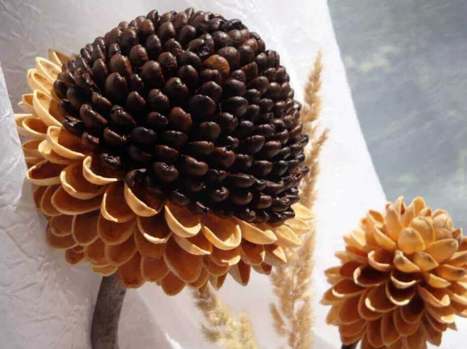 Для маленьких деток нужно что-то попроще. Поэтому предлагаю использовать природный материал для букетов. Мы рассмотрим идеи из шишек, скорлупок арахиса и фисташек, тыквенных семечек, сухоцветов.