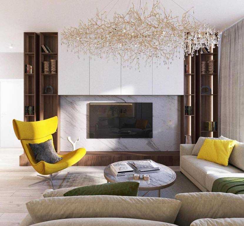 Светлый оттенок слоновой кости с желтоватым красивым нежным тоном всегда ассоциируется с чистотой. Если оформить в этой гамме гостиную, она будет смотреться элегантно и стильно, какие бы компаньоны не были выбраны для разбавления монохрома. В такой комнате человек будет чувствовать себя спокойно, размеренно. На формирование настроения интерьера влияет стилистическая концепция.