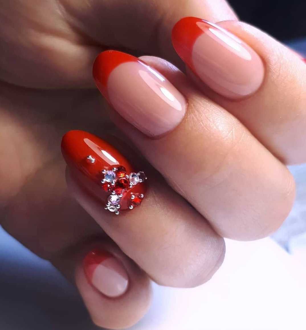 Для создания яркого необычного дизайна алые оттенки можно сочетать с трендовым в следующем году белым цветом. Плавный переход от красного к белому создаст эффект французского маникюра.