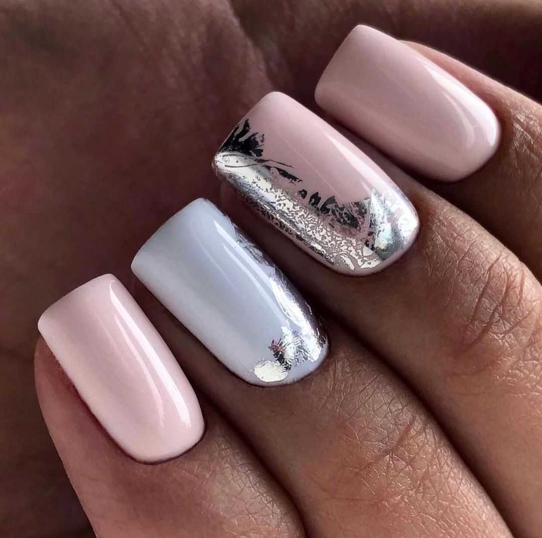 Фольга — самый трендовый вариант декора ногтей. Для выполнения праздничного дизайна пригодятся эти очень тонкие металлические пластины. Они могут быть разных оттенков: платинового, золотого, медного, изумрудного, рубинового и других. Если аккуратно нанести на покрытие один элемент из фольги, то можно получить красивый переливающийся орнамент разных форм и очертаний.