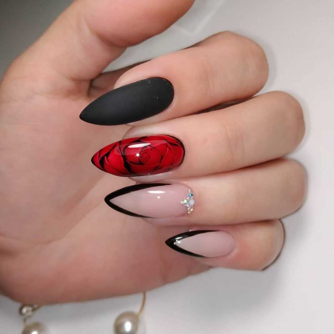 Черно-красный маникюр создает контрастный, но гармоничный дуэт. Черно-красный маникюр – это сочетание для темпераментных, эмоциональных и страстных девушек. Дизайн ногтей подойдет на все случаи жизни. Отлично сочетается со строгим деловым костюмом, так и с праздничным нарядом. Черно-красный маникюр может быть выполнен со стразами или же можно сделать эффектный градиент.