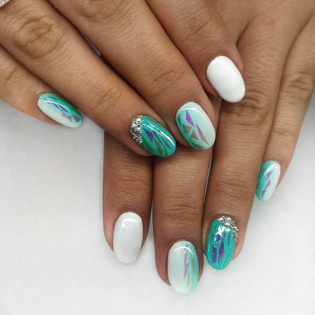 - Свадебный маникюр в бирюзовых тонах как альтернативный вариант голубому оттенку.