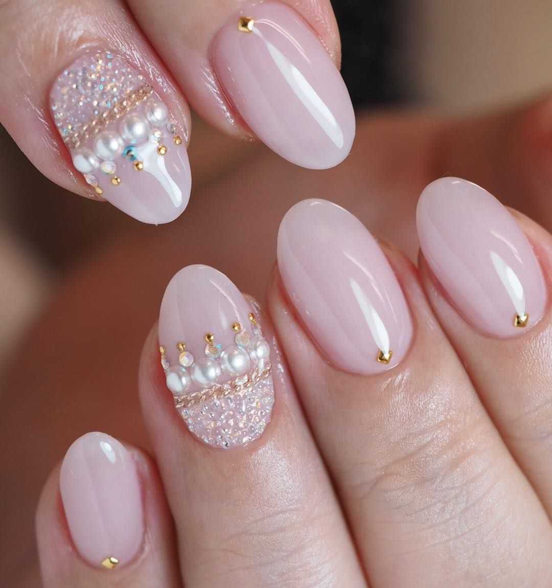 - нанесение на ногти бусин, имитирующих жемчужины свадебного ожерелья или серег;